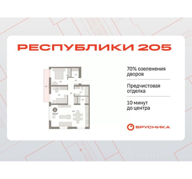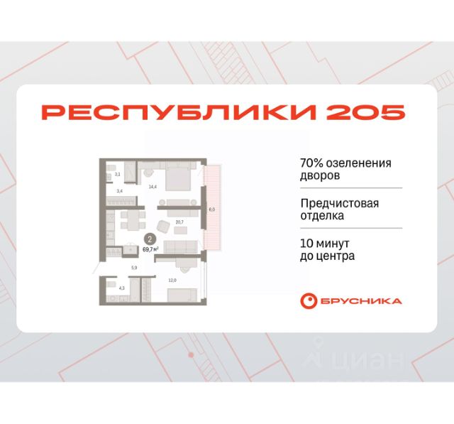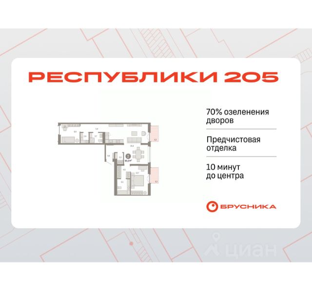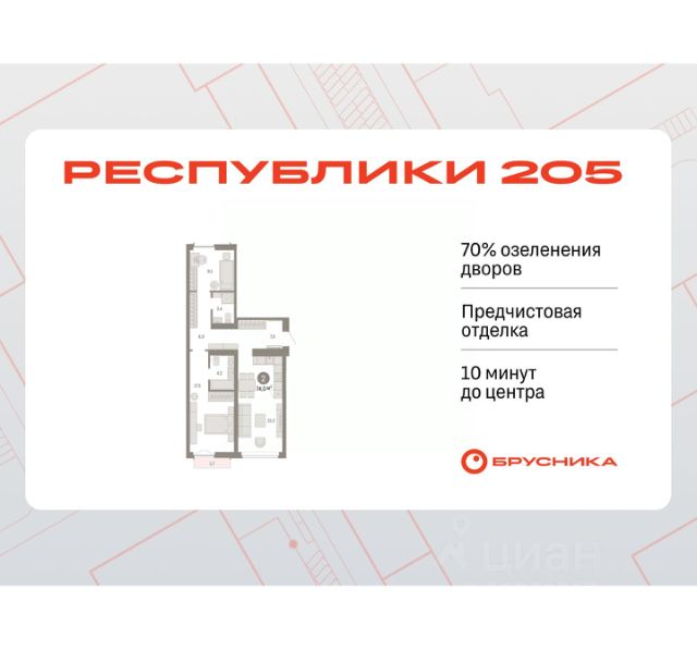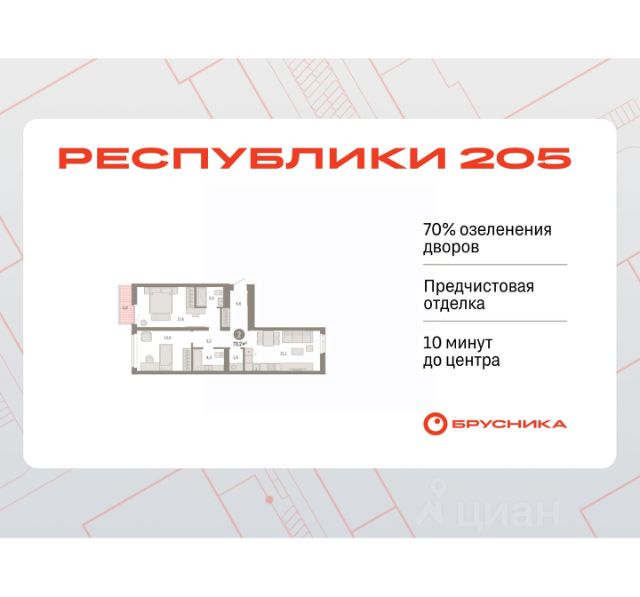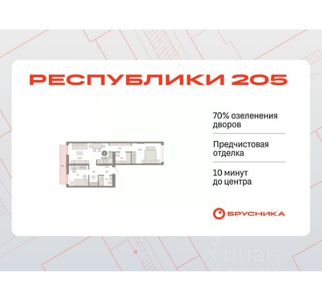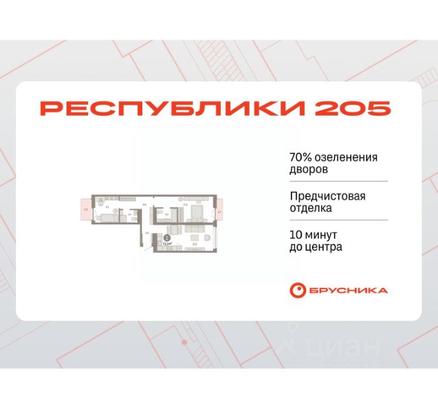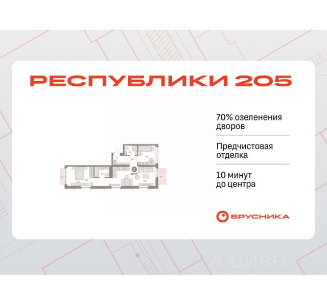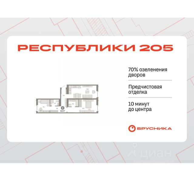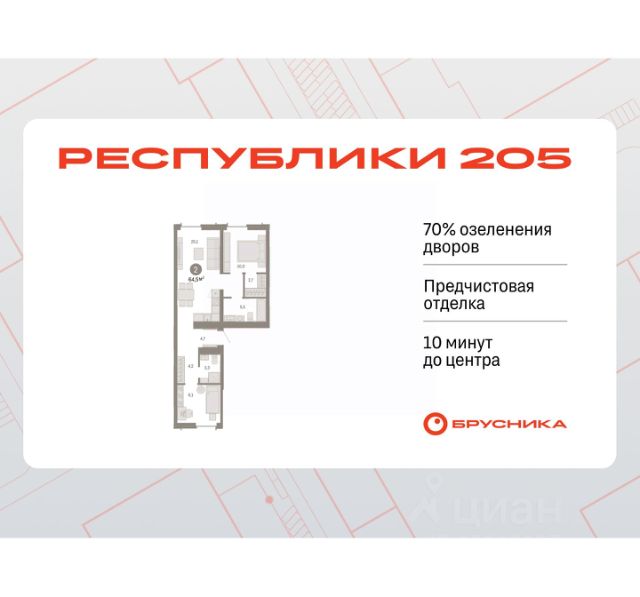 Квартира в счёт первоначального взноса по программе обмена. По всем вопросам обращайтесь в офис продаж, мы вам все подробно расскажем! Двухкомнатная квартира с предчистовой отделкой в ЖК "Республики 205" на 4 этаже. Общая площадь: 68.59 кв.м., жилая: 26.5 кв.м., площадь просторной кухни-гостиной: 22.2 кв.м. Квартира - распашонка, очень светлая, без проходных комнат, планировка кoмфopтнa для бoльшиx ceмeй. В квартире два совмещенных санузла. Высота потолков 2.7 м. Купить квартиру можно с помощью программ покупки от застройщика Брусника: - ипотека по эксклюзивной ставке с помощью в получении положительного кредитного решения через сервис ипотечный брокер; - квартиры в рассрочку без процентов от застройщика Брусника; - обмен квартиры на новую. Получить одобрение ипотеки или рассрочку, а также осуществить обмен квартир можно онлайн. Дом монолитный, многоподъездный, переменной этажности, от 7 до 16 этажей. Квартира находится в 4-й секции высотой 7 этажей в корпусе 2. На этаже 4 квартиры. В подъезде 1 грузовой лифт. Начало строительства - 1 квартал 2024 года. Окончание строительства - 1 квартал 2026 года. Оформление сделки по договору долевого участия. Район Проект расположен в границах улиц Пермякова, Энергетиков, Воровского и Республики. До центра города — 10 минут на машине. Рядом — автомобильная развязка на пересечении улиц Пермякова и Республики. В шаговой доступности есть школы, детские сады, поликлиники, крупный торговый центр, автовокзал и несколько скверов. Проект "Республики 205" — это проект комплексного развития территории, уникальный по своему наполнению. Переосмысляя бывшую территорию завода медицинского оборудования, мы создадим новое место силы — микрорайон, насыщенный деловой, развлекательной, рекреационной, игровой, образовательной и медицинской инфраструктурой. До каждого полезного сервиса здесь можно будет дойти за 15 минут. Локальными центрами "Республики 205" будут общественные пространства — скверы, парки, бульвары и площади. В границах нашего участка мы намерены разместить школу, рассчитанную на 1550 учеников, два детских сада на 300 мест и встроенный детский сад на 100 мест. В одном из цехов бывшего завода расположится креативный кластер "Кузница". Он станет площадкой для нескольких институций — галереи, лектория, книжного магазина-библиотеки, кинобара и точек креативного pop-up-ритейла. Пешеходные бульвары внутри района соединят между собой улицу ресторанов, детские и спортивные площадки, событийную площадь и летний кинотеатр. Идентификатор квартиры по базе застройщика: РСП-02-4-4. #zsmE43