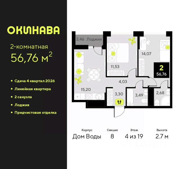 2-комн. квартира от застройщика с предчистовой отделкой в ЖК "Окинава" на 4 этаже. Общая площадь: 56.76 кв.м., жилая: 25.6 кв.м., площадь просторной кухни-столовой: 15.2 кв.м. Комнаты изолированные, все окна выходят на одну сторону. В квартире одна лоджия, два совмещенных санузла. Высота потолков 2.7 м.