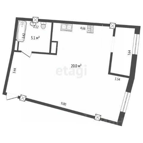Просторная кухня правильной формы, гостиная 17, м² с окнами на две стороны и выходом на лоджию.