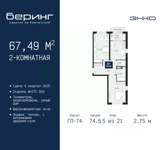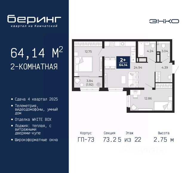 Двухкомнатная квартира в ЖК "Беринг" на 5 этаже. Квартира без отделки, после оформления собственности можно делать ремонт. Общая площадь: 59.96 кв.м., жилая: 25.01 кв.м., площадь просторной кухни-столовой: 15.21 кв.м. Квартира - распашонка, без проходных комнат, окна выходят на paзные стороны дома. В квартире одна лоджия, один совмещенный и один раздельный санузел. Высота потолков 2.75 м. Дом монолитный, многоподъездный, переменной этажности, от 9 до 22 этажей. Квартира находится в 73.2-й секции высотой 22 этажа в корпусе ГП-73. На этаже 7 квартир. В подъезде 1 пассажирский и 1 грузовой лифт. Окончание строительства - 4 квартал 2025 года. Оформление сделки по договору долевого участия. Подобно знаменитому исследователю, мы чувствуем себя первооткрывателями этой локации. Хотим показать новую суть места, сформировать для вас жизненный опыт, которого ещё не было. Беринг — район зелёного цвета. Беринг — район, который откроется вам с другой стороны. Впечатлит новым уровнем комфорта и качеством жизни. Беринг — открытие на карте города. Первый квартал расположен в районе Тура, в границах улиц: Камчатская Западносибирская Энтузиастов. Вокруг уже есть всё для того, чтобы ежедневная рутина была лишь частью жизни и не доставляла дискомфорта. Школы и детские сады, магазины и аптеки, поликлиника, места для семейного отдыха, пеших и велопрогулок, и даже рыбалки. Масштабное озеленение дворов — визитная карточка ЭНКО и ваш оазис спокойствия, чтобы отвлечься от повседневности. Раскидистые деревья, кустарники, травы и цветы — осталось остановиться, вдохнуть и расслабиться, глядя на эту природную красоту. Стилистика подъездов продолжает концепцию Беринга, вдохновлённого Камчаткой: сдержанный, но при этом впечатляющий дизайн соседствует с удобством и функциональностью. #ZuStIe