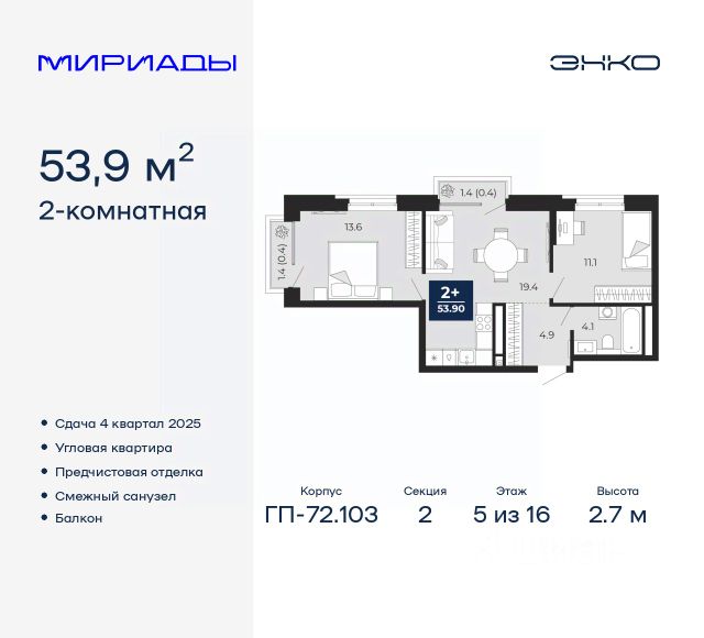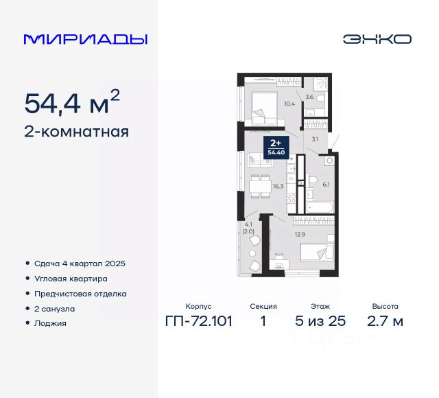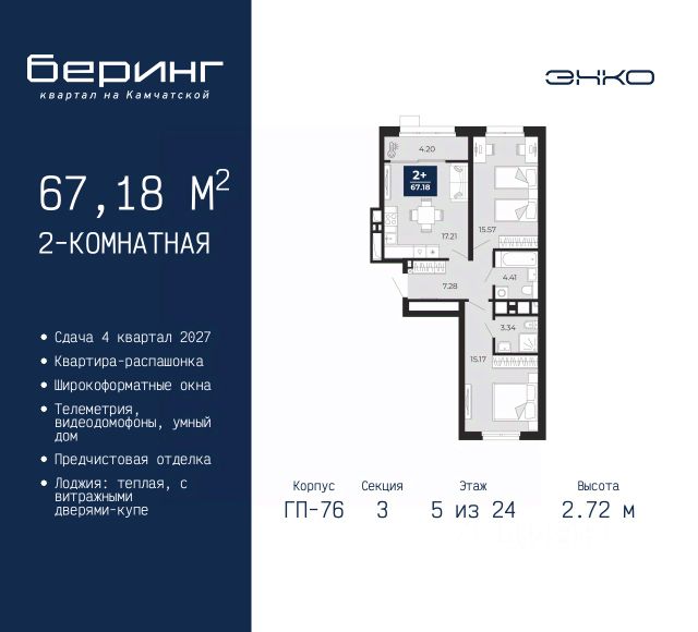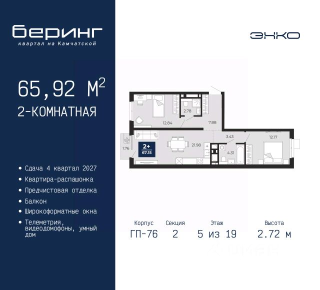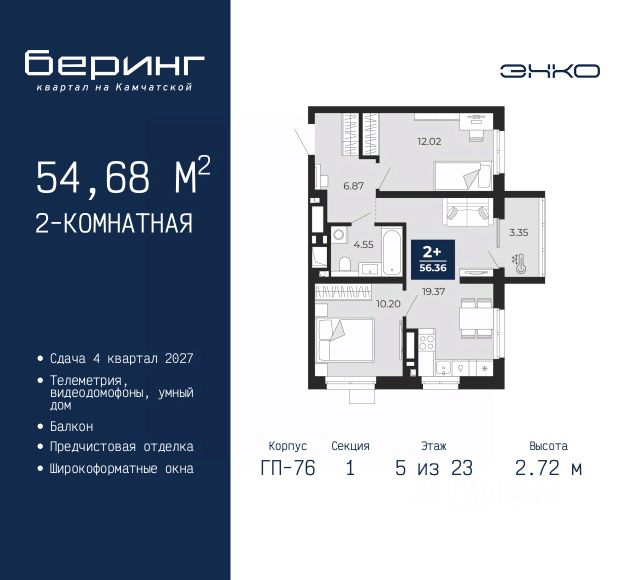 Двухкомнатная квартира от застройщика с предчистовой отделкой в ЖК "Беринг" на 5 этаже. Общая площадь: 54.68 кв.м., жилая: 22.22 кв.м., площадь просторной кухни-столовой: 19.37 кв.м. Угловая квартира, очень светлая, естественная вентиляция при открытии окон. В квартире один балкон, один совмещенный санузел. Высота потолков 2.72 м. Дом монолитный, черырехподъездный, переменной этажности, от 19 до 24 этажей. Квартира находится в 1-й секции высотой 23 этажа в корпусе ГП-76. На этаже 7 квартир. В подъезде 2 пассажирских и 1 грузовой лифт. Окончание строительства - 4 квартал 2027 года. Оформление сделки по договору долевого участия. Подобно знаменитому исследователю, мы чувствуем себя первооткрывателями этой локации. Хотим показать новую суть места, сформировать для вас жизненный опыт, которого ещё не было. Беринг — район зелёного цвета. Беринг — район, который откроется вам с другой стороны. Впечатлит новым уровнем комфорта и качеством жизни. Беринг — открытие на карте города. Первый квартал расположен в районе Тура, в границах улиц: Камчатская Западносибирская Энтузиастов. Вокруг уже есть всё для того, чтобы ежедневная рутина была лишь частью жизни и не доставляла дискомфорта. Школы и детские сады, магазины и аптеки, поликлиника, места для семейного отдыха, пеших и велопрогулок, и даже рыбалки. Масштабное озеленение дворов — визитная карточка ЭНКО и ваш оазис спокойствия, чтобы отвлечься от повседневности. Раскидистые деревья, кустарники, травы и цветы — осталось остановиться, вдохнуть и расслабиться, глядя на эту природную красоту. Стилистика подъездов продолжает концепцию Беринга, вдохновлённого Камчаткой: сдержанный, но при этом впечатляющий дизайн соседствует с удобством и функциональностью. #ZmMBbD