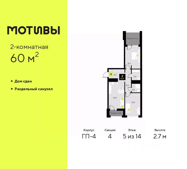 Дом монолитный, двухподъездный, переменной этажности, от 12 до 14 этажей. Квартира находится в 1-й секции высотой 14 этажей в корпусе ГП-1. На этаже 12 квартир. В подъезде 1 пассажирский и 1 грузовой лифт. Строительство завершено, дом сдан в 4 квартале 2024 года. Оформление сделки по договору купли-продажи.