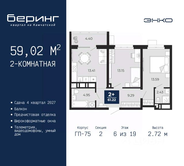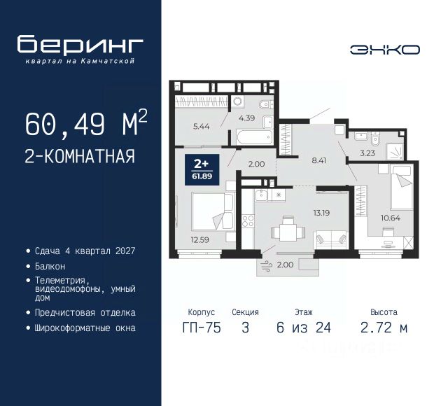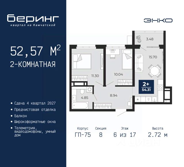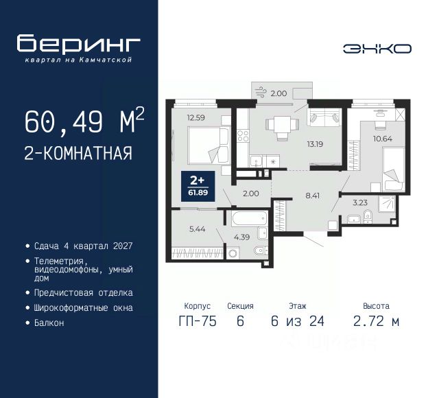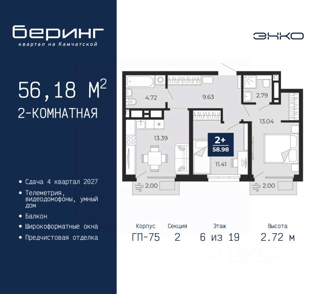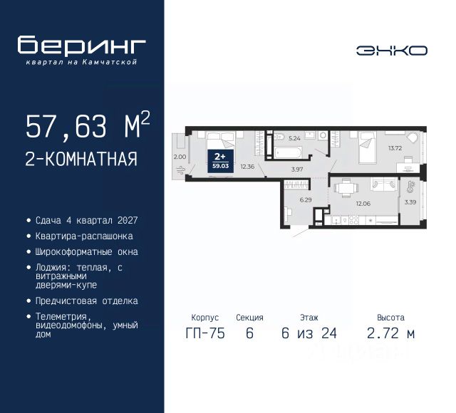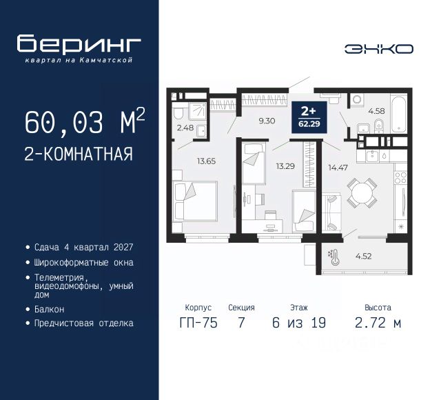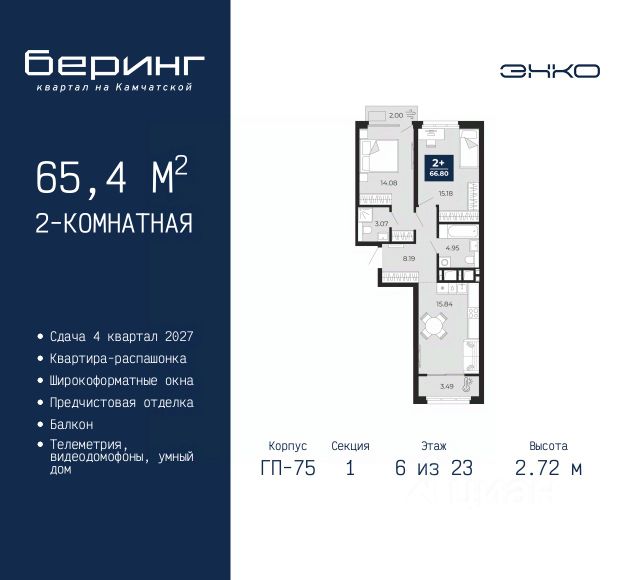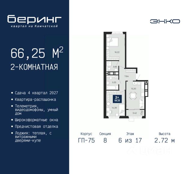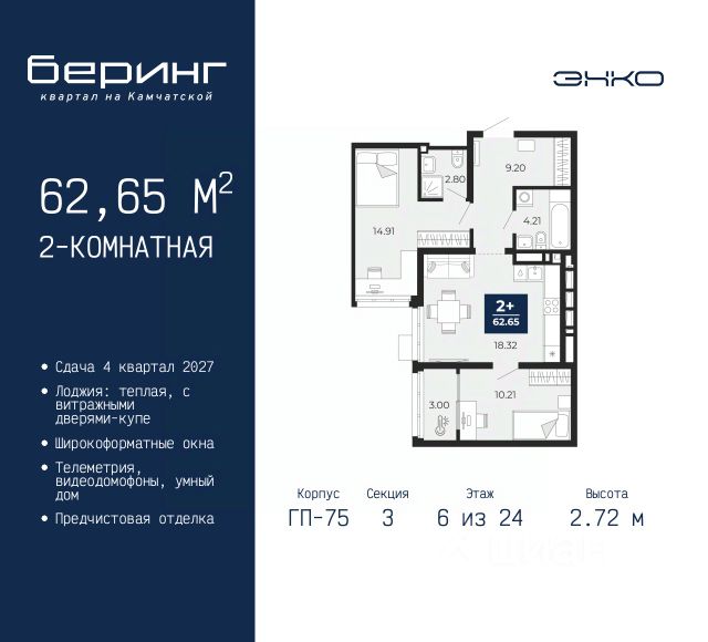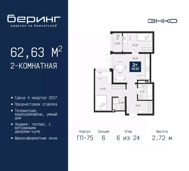Продается 2-комн. квартира в ЖК "Беринг" на 6 этаже. Квартира без отделки, полностью готова к чистовой отделке и дальнейшему ремонту. Общая площадь: 66.65 кв.м., жилая: 27.48 кв.м., площадь просторной кухни-столовой: 24.37 кв.м. Угловая квартира, идеально подойдет любителям тишины и панорамных видов. В квартире одна лоджия, один совмещенный и один раздельный санузел. Высота потолков 2.75 м. Дом монолитный, многоподъездный, переменной этажности, от 9 до 21 этажей. Квартира находится в 74.5-й секции высотой 21 этаж в корпусе ГП-74. На этаже 7 квартир. В подъезде 1 пассажирский и 1 грузовой лифт. Окончание строительства - 4 квартал 2025 года. Оформление сделки по договору долевого участия. Подобно знаменитому исследователю, мы чувствуем себя первооткрывателями этой локации. Хотим показать новую суть места, сформировать для вас жизненный опыт, которого ещё не было. Беринг — район зелёного цвета. Беринг — район, который откроется вам с другой стороны. Впечатлит новым уровнем комфорта и качеством жизни. Беринг — открытие на карте города. Первый квартал расположен в районе Тура, в границах улиц: Камчатская Западносибирская Энтузиастов. Вокруг уже есть всё для того, чтобы ежедневная рутина была лишь частью жизни и не доставляла дискомфорта. Школы и детские сады, магазины и аптеки, поликлиника, места для семейного отдыха, пеших и велопрогулок, и даже рыбалки. Масштабное озеленение дворов — визитная карточка ЭНКО и ваш оазис спокойствия, чтобы отвлечься от повседневности. Раскидистые деревья, кустарники, травы и цветы — осталось остановиться, вдохнуть и расслабиться, глядя на эту природную красоту. Стилистика подъездов продолжает концепцию Беринга, вдохновлённого Камчаткой: сдержанный, но при этом впечатляющий дизайн соседствует с удобством и функциональностью. #23576d