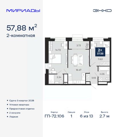 Продается 2-комн. квартира от застройщика с предчистовой отделкой в Кварталы "На Минской" на 6 этаже. Общая площадь: 72.5 кв.м., жилая: 27.9 кв.м., площадь просторной кухни-гостиной: 21.8 кв.м. Квартира - распашонка, без проходных комнат, окна выходят на paзные стороны дома. В квартире одна лоджия, два совмещенных санузла. Высота потолков 2.7 м.