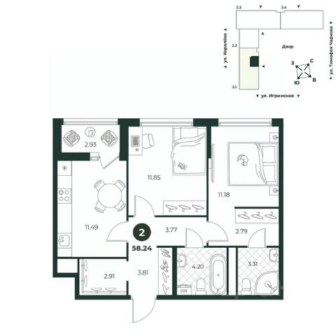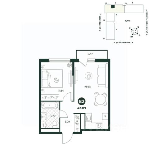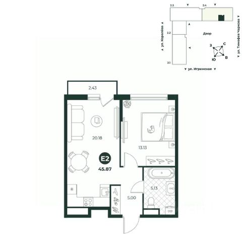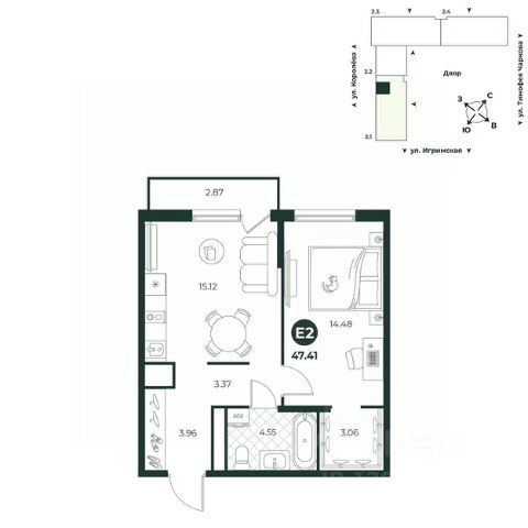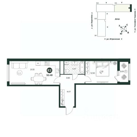 Евродвухкомнатная квартира с выходом на французский балкон из спальни. Просторная кухня-гостиная идеально подходит для размещения семейного обеденного стола и детской игровой зоны. В прихожей достаточно места для расположения шкафа. Санузел совмещенный. Окна выходят во двор.