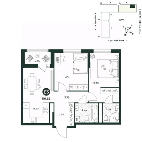 Классическая двухкомнатная квартира с мастер-спальней, обустроенной гардеробной. Из кухни можно выйти на лоджию, где можно расположить зону отдыха или рабочий уголок. В квартире предусмотрено два санузла - гостевой и полноценная ванная комната. В прихожей есть ниша под шкаф.