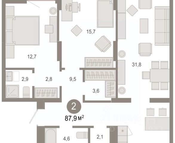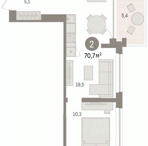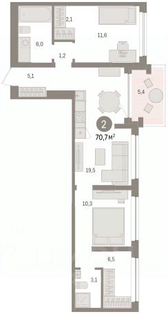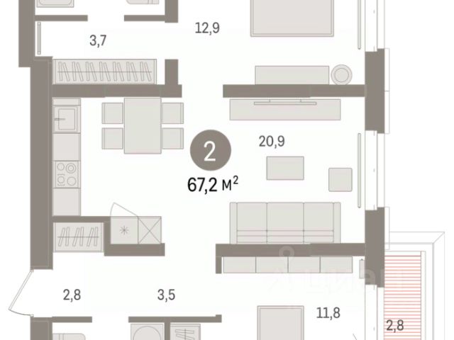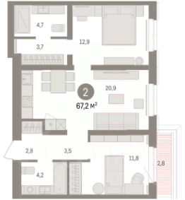 Двухкомнатная квартира от застройщика с предчистовой отделкой в ЖК "Республики 205" на 6 этаже. Общая площадь: 69.69 кв.м., жилая: 21.4 кв.м., площадь просторной кухни-гостиной: 21 кв.м. Угловая квартира, окна oбecпeчивaют paвнoмepнoe ocвeщeниe в тeчeниe дня. В квартире один балкон, один совмещенный и один раздельный санузел. Терраса площадью 8.2 кв.м. представляет собой роскошную зону отдыха для проведение вечеров в кругу семьи и друзей или организация вечеринок. Высота потолков 2.6 м.