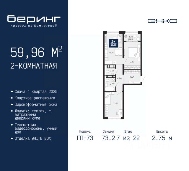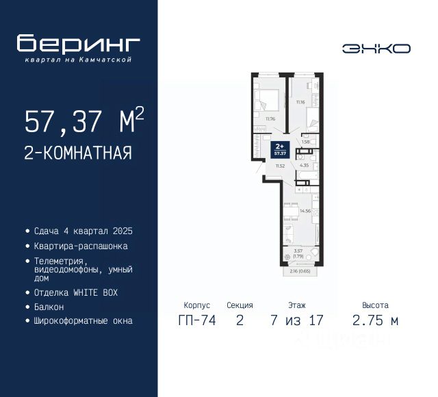 Продается двухкомнатная квартира в ЖК "Беринг" на 7 этаже. Квартира без отделки, полностью готова к ремонту. Общая площадь: 66.65 кв.м., жилая: 27.48 кв.м., площадь просторной кухни-столовой: 24.37 кв.м. Квартира угловая, идеально подойдет любителям тишины и панорамных видов. В квартире одна лоджия, один совмещенный и один раздельный санузел. Высота потолков 2.75 м. Дом монолитный, многоподъездный, переменной этажности, от 9 до 21 этажей. Квартира находится в 74.5-й секции высотой 21 этаж в корпусе ГП-74. На этаже 7 квартир. В подъезде 1 пассажирский и 1 грузовой лифт. Окончание строительства - 4 квартал 2025 года. Оформление сделки по договору долевого участия. Подобно знаменитому исследователю, мы чувствуем себя первооткрывателями этой локации. Хотим показать новую суть места, сформировать для вас жизненный опыт, которого ещё не было. Беринг — район зелёного цвета. Беринг — район, который откроется вам с другой стороны. Впечатлит новым уровнем комфорта и качеством жизни. Беринг — открытие на карте города. Первый квартал расположен в районе Тура, в границах улиц: Камчатская Западносибирская Энтузиастов. Вокруг уже есть всё для того, чтобы ежедневная рутина была лишь частью жизни и не доставляла дискомфорта. Школы и детские сады, магазины и аптеки, поликлиника, места для семейного отдыха, пеших и велопрогулок, и даже рыбалки. Масштабное озеленение дворов — визитная карточка ЭНКО и ваш оазис спокойствия, чтобы отвлечься от повседневности. Раскидистые деревья, кустарники, травы и цветы — осталось остановиться, вдохнуть и расслабиться, глядя на эту природную красоту. Стилистика подъездов продолжает концепцию Беринга, вдохновлённого Камчаткой: сдержанный, но при этом впечатляющий дизайн соседствует с удобством и функциональностью. #ZUStmc