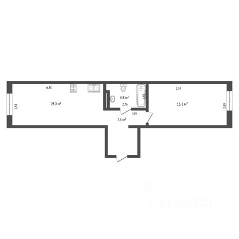 Однокомнатная квартира площадью 47,4 кв.м, расположенная на 1 этаже десятиэтажного дома в новом жилом комплексе повышенного уровня комфортности. Распашонка. Жилая площадь 19 кв.м. Окна выходят во двор и на улицу. Большая кухня - гостиная площадью 19 кв.м. правильной прямоугольной формы площадью 10 кв.м. Высота потолков 2,7 м. Санузел совмещенный.