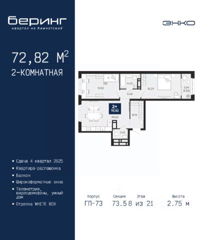 Двухкомнатная квартира в ЖК "Беринг" на 8 этаже. Квартира без отделки, полностью готова к чистовой отделке и дальнейшему ремонту. Общая площадь: 58.42 кв.м., жилая: 22.56 кв.м., площадь просторной кухни-столовой: 16.04 кв.м. Комнаты изолированные, все окна выходят на одну сторону. В квартире одна лоджия, один совмещенный и один раздельный санузел. Высота потолков 2.75 м. Дом монолитный, многоподъездный, переменной этажности, от 9 до 21 этажей. Квартира находится в 3-й секции высотой 9 этажей в корпусе ГП-74. На этаже 7 квартир. В подъезде 1 грузовой лифт. Окончание строительства - 4 квартал 2025 года. Оформление сделки по договору долевого участия. Подобно знаменитому исследователю, мы чувствуем себя первооткрывателями этой локации. Хотим показать новую суть места, сформировать для вас жизненный опыт, которого ещё не было. Беринг — район зелёного цвета. Беринг — район, который откроется вам с другой стороны. Впечатлит новым уровнем комфорта и качеством жизни. Беринг — открытие на карте города. Первый квартал расположен в районе Тура, в границах улиц: Камчатская Западносибирская Энтузиастов. Вокруг уже есть всё для того, чтобы ежедневная рутина была лишь частью жизни и не доставляла дискомфорта. Школы и детские сады, магазины и аптеки, поликлиника, места для семейного отдыха, пеших и велопрогулок, и даже рыбалки. Масштабное озеленение дворов — визитная карточка ЭНКО и ваш оазис спокойствия, чтобы отвлечься от повседневности. Раскидистые деревья, кустарники, травы и цветы — осталось остановиться, вдохнуть и расслабиться, глядя на эту природную красоту. Стилистика подъездов продолжает концепцию Беринга, вдохновлённого Камчаткой: сдержанный, но при этом впечатляющий дизайн соседствует с удобством и функциональностью. #ZmA41e