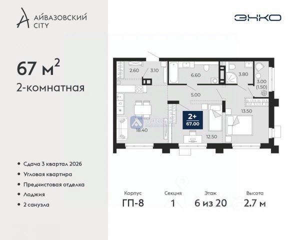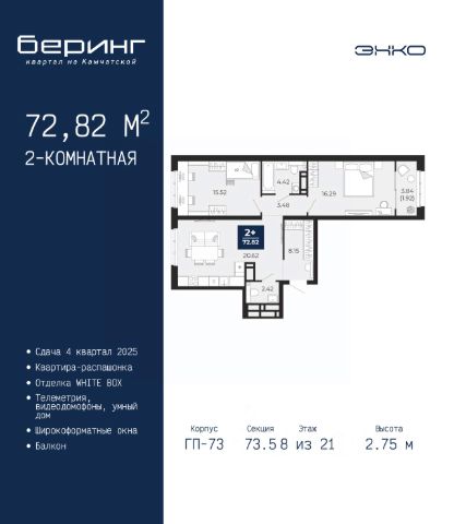 Двухкомнатная квартира с предчистовой отделкой в ЖК "Мотивы" на 8 этаже. Общая площадь: 53.95 кв.м., жилая: 24.24 кв.м., площадь просторной кухни-столовой: 20.1 кв.м. Комнаты изолированные, все окна выходят на одну сторону. В квартире одна лоджия, один совмещенный санузел. Высота потолков 2.7 м. Квартира будет сдаваться с предчистовой отделкой White Box: выровнены и оштукатурены стены, проведено электричество и отопление, установлены радиаторы. Вы также можете приобрести квартиру с ремонтом от застройщика, представленным в трех цветовых решениях Scandi, Wood и Coffee и включающим ламинат, обои под покраску, двери, натяжной потолок и санузел с сантехникой. При желании вы можете заказать отделку под ключ, варианты возможных решений представлены в альбоме фотографий. Дом монолитный, многоподъездный, переменной этажности, от 5 до 14 этажей. Квартира находится в 5-й секции высотой 14 этажей в корпусе ГП-4. На этаже 5 квартир. В подъезде 1 пассажирский и 1 грузовой лифт. В настоящее время строительство окончено, дом сдан в 4 квартале 2024 года. Оформление сделки по договору купли-продажи. Закрытая от автомобилей территория, безопасный двор и камеры видеонаблюдения - гаранты вашего спокойствия. Квартал будет располагать богатой инфраструктурой: на первых этажах разместятся магазины, пекарни, кофейни, пункты выдачи, аптеки, детские центры, цветочные салоны и многое другое, что сделает жизнь поистине комфортной. Рядом находится парк общей площадью почти 5000 м², в котором располагаются локации для игр и отдыха жителей, здесь можно совершить утреннюю пробежку или прогуляться после рабочего дня. В парке есть зона воркаута с тренажерами для взрослых, игровые комплексы с горками и канатный комплекс для детей разных возрастов, качели и лавочки для отдыха, площадки для командных видов спорта и для панна-футбола. В ЖК "Мотивы" всё продумано до мелочей: светлые холлы входных групп, оформленные в едином стиле, просторные колясочные, лапомойки для питомцев. На территории комплекса находятся 2 8-ми этажных паркинга и более 1000 м/м на открытой парковке. Жилой комплекс находится в одном из экологически благоприятных районов Тюмени, недалеко от Плехановского бора. При этом до центра города можно добраться за 15 минут, а до международного аэропорта Рощино за 13 минут. Окончание строительства: ГП 1, 2, 3, 4 сдача до конца 2024 года, ГП 6, 7, 8 сдача 2 квартал 2026 года. #2WAcge