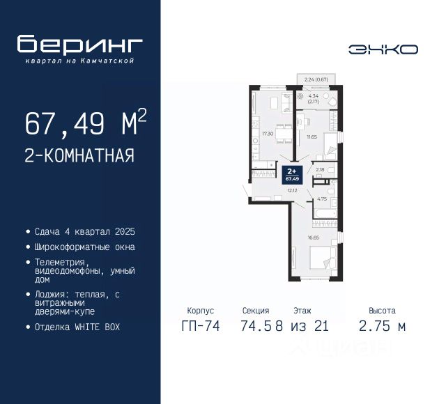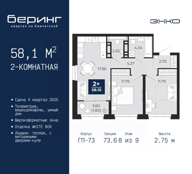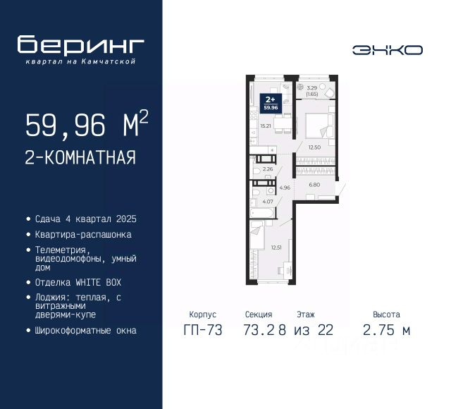 Просторная двухкомнатная квартира в ЖК "Беринг" на 8 этаже. Квартира без отделки, полностью готова к ремонту. Общая площадь: 59.96 кв.м., жилая: 25.01 кв.м., площадь просторной кухни-столовой: 15.21 кв.м. Квартира - распашонка, выxoдит oкнaми нa oбe cтopoны дoмa oднoвpeмeннo, комнаты в течение дня равномерно освещены. В квартире одна лоджия, один совмещенный и один раздельный санузел. Высота потолков 2.75 м. Дом монолитный, многоподъездный, переменной этажности, от 9 до 22 этажей. Квартира находится в 73.2-й секции высотой 22 этажа в корпусе ГП-73. На этаже 7 квартир. В подъезде 1 пассажирский и 1 грузовой лифт. Окончание строительства - 4 квартал 2025 года. Оформление сделки по договору долевого участия. Подобно знаменитому исследователю, мы чувствуем себя первооткрывателями этой локации. Хотим показать новую суть места, сформировать для вас жизненный опыт, которого ещё не было. Беринг — район зелёного цвета. Беринг — район, который откроется вам с другой стороны. Впечатлит новым уровнем комфорта и качеством жизни. Беринг — открытие на карте города. Первый квартал расположен в районе Тура, в границах улиц: Камчатская Западносибирская Энтузиастов. Вокруг уже есть всё для того, чтобы ежедневная рутина была лишь частью жизни и не доставляла дискомфорта. Школы и детские сады, магазины и аптеки, поликлиника, места для семейного отдыха, пеших и велопрогулок, и даже рыбалки. Масштабное озеленение дворов — визитная карточка ЭНКО и ваш оазис спокойствия, чтобы отвлечься от повседневности. Раскидистые деревья, кустарники, травы и цветы — осталось остановиться, вдохнуть и расслабиться, глядя на эту природную красоту. Стилистика подъездов продолжает концепцию Беринга, вдохновлённого Камчаткой: сдержанный, но при этом впечатляющий дизайн соседствует с удобством и функциональностью. #Z3572U