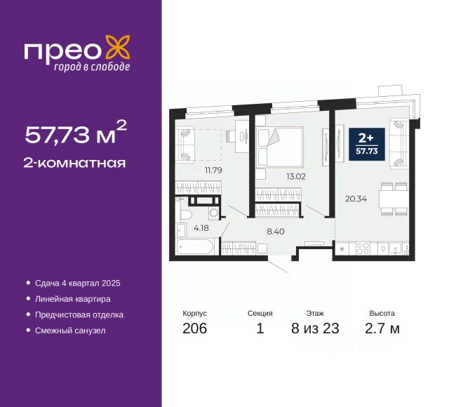 Просторная двухкомнатная квартира с предчистовой отделкой в ЖК "Прео" на 8 этаже. Общая площадь: 59.21 кв.м., жилая: 23.36 кв.м., площадь просторной кухни-столовой: 20.68 кв.м. Угловая квартира, очень светлая, естественная вентиляция при открытии окон. В квартире один балкон, один совмещенный санузел. Высота потолков 2.7 м.