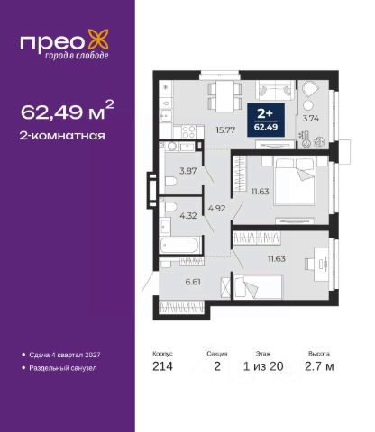 2-комн. квартира от застройщика в ЖК "Прео" на 2 этаже. Общая площадь: 64.9 кв.м. Высота потолков 2.7 м.