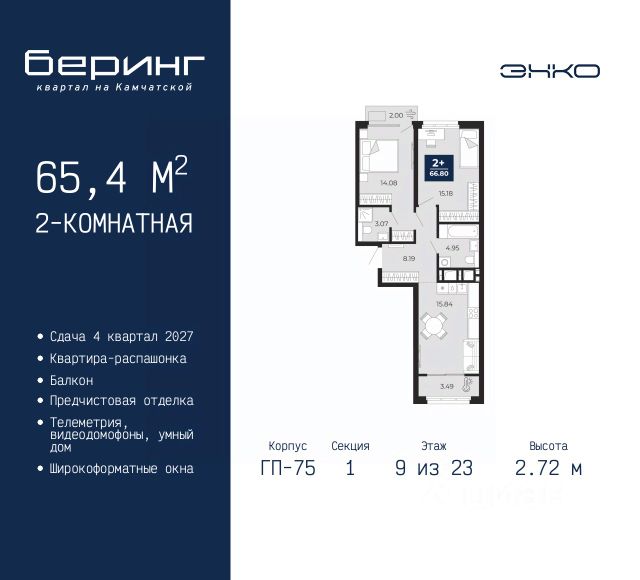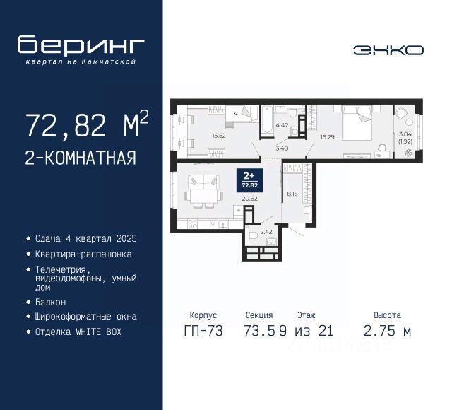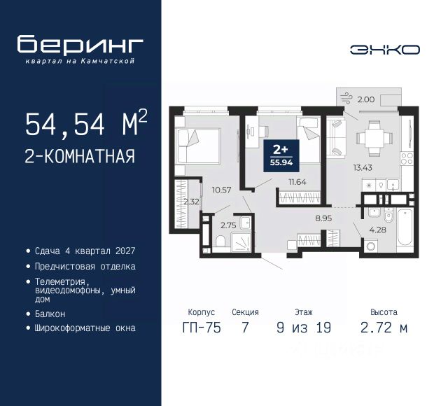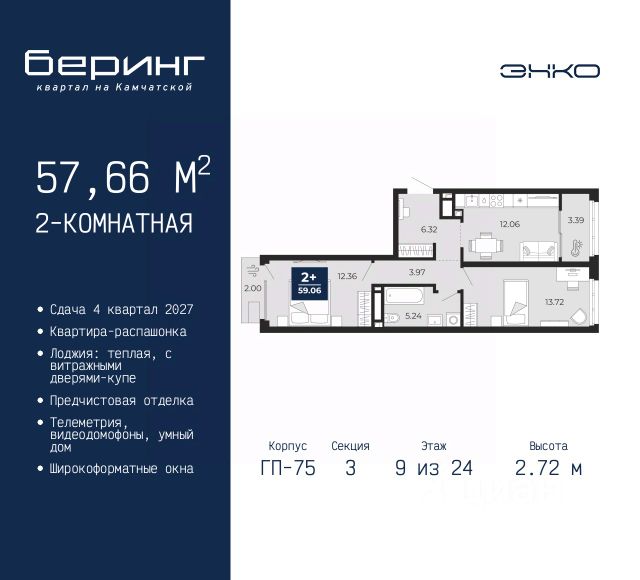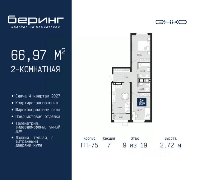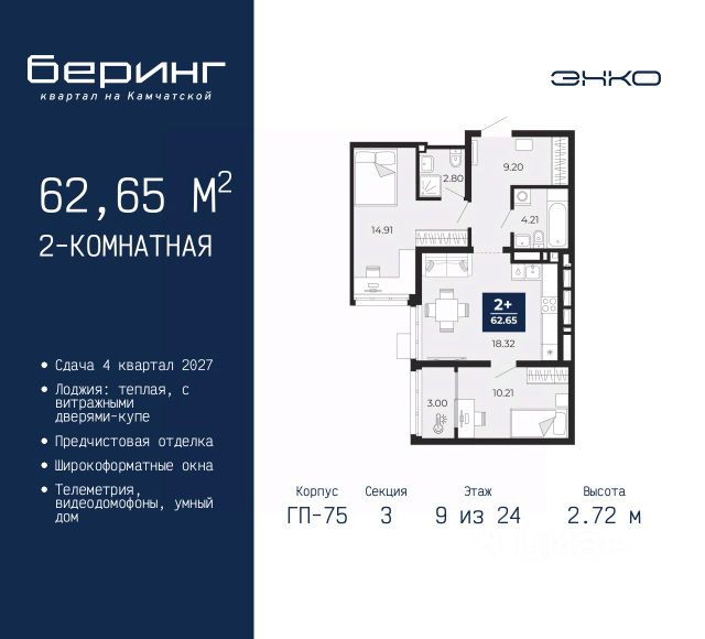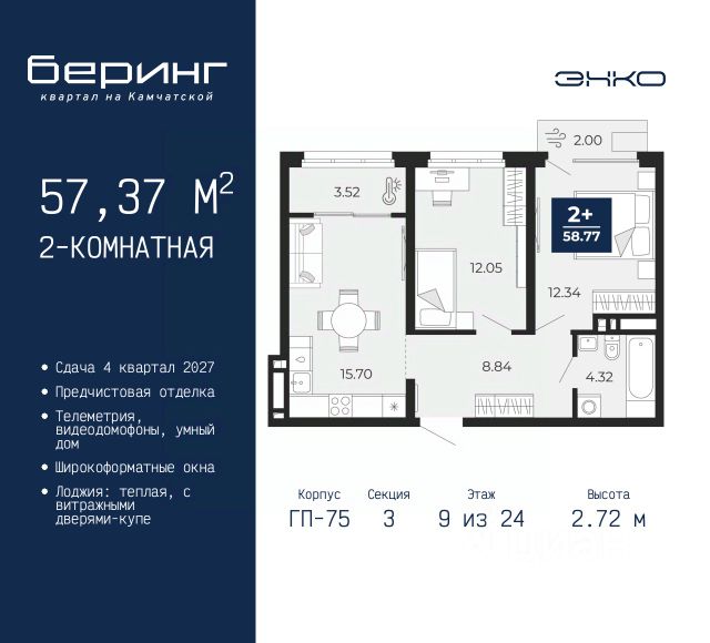 Двухкомнатная квартира с предчистовой отделкой в ЖК "Беринг" на 9 этаже. Общая площадь: 52.57 кв.м., жилая: 21.34 кв.м., площадь просторной кухни-столовой: 15.7 кв.м. Комнаты изолированные, все окна выходят на одну сторону. В квартире один балкон, один совмещенный санузел. Высота потолков 2.72 м. Дом монолитный, многоподъездный, переменной этажности, от 17 до 24 этажей. Квартира находится в 8-й секции высотой 17 этажей в корпусе ГП-75. На этаже 8 квартир. В подъезде 2 пассажирских и 1 грузовой лифт. Окончание строительства - 4 квартал 2027 года. Оформление сделки по договору долевого участия. Подобно знаменитому исследователю, мы чувствуем себя первооткрывателями этой локации. Хотим показать новую суть места, сформировать для вас жизненный опыт, которого ещё не было. Беринг — район зелёного цвета. Беринг — район, который откроется вам с другой стороны. Впечатлит новым уровнем комфорта и качеством жизни. Беринг — открытие на карте города. Первый квартал расположен в районе Тура, в границах улиц: Камчатская Западносибирская Энтузиастов. Вокруг уже есть всё для того, чтобы ежедневная рутина была лишь частью жизни и не доставляла дискомфорта. Школы и детские сады, магазины и аптеки, поликлиника, места для семейного отдыха, пеших и велопрогулок, и даже рыбалки. Масштабное озеленение дворов — визитная карточка ЭНКО и ваш оазис спокойствия, чтобы отвлечься от повседневности. Раскидистые деревья, кустарники, травы и цветы — осталось остановиться, вдохнуть и расслабиться, глядя на эту природную красоту. Стилистика подъездов продолжает концепцию Беринга, вдохновлённого Камчаткой: сдержанный, но при этом впечатляющий дизайн соседствует с удобством и функциональностью. #zm99Tv