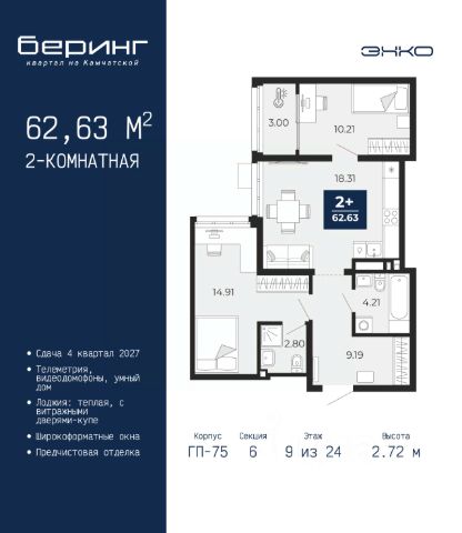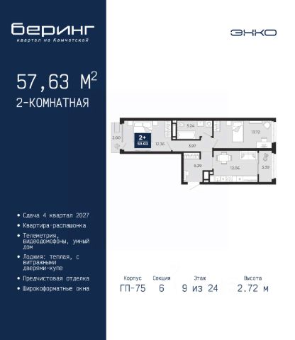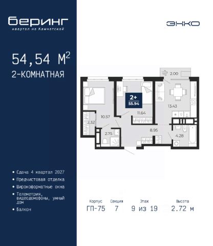 Просторная 2-комн. квартира с предчистовой отделкой в ЖК "Беринг" на 9 этаже. Общая площадь: 53.72 кв.м., жилая: 20.97 кв.м., площадь просторной кухни-столовой: 15.95 кв.м. Комнаты изолированные, все окна выходят на одну сторону. В квартире один балкон, один совмещенный санузел. Высота потолков 2.72 м. Дом монолитный, многоподъездный, переменной этажности, от 17 до 24 этажей. Квартира находится в 1-й секции высотой 23 этажа в корпусе ГП-75. На этаже 8 квартир. В подъезде 2 пассажирских и 1 грузовой лифт. Окончание строительства - 4 квартал 2027 года. Оформление сделки по договору долевого участия. Подобно знаменитому исследователю, мы чувствуем себя первооткрывателями этой локации. Хотим показать новую суть места, сформировать для вас жизненный опыт, которого ещё не было. Беринг — район зелёного цвета. Беринг — район, который откроется вам с другой стороны. Впечатлит новым уровнем комфорта и качеством жизни. Беринг — открытие на карте города. Первый квартал расположен в районе Тура, в границах улиц: Камчатская Западносибирская Энтузиастов. Вокруг уже есть всё для того, чтобы ежедневная рутина была лишь частью жизни и не доставляла дискомфорта. Школы и детские сады, магазины и аптеки, поликлиника, места для семейного отдыха, пеших и велопрогулок, и даже рыбалки. Масштабное озеленение дворов — визитная карточка ЭНКО и ваш оазис спокойствия, чтобы отвлечься от повседневности. Раскидистые деревья, кустарники, травы и цветы — осталось остановиться, вдохнуть и расслабиться, глядя на эту природную красоту. Стилистика подъездов продолжает концепцию Беринга, вдохновлённого Камчаткой: сдержанный, но при этом впечатляющий дизайн соседствует с удобством и функциональностью. #z6g9TF