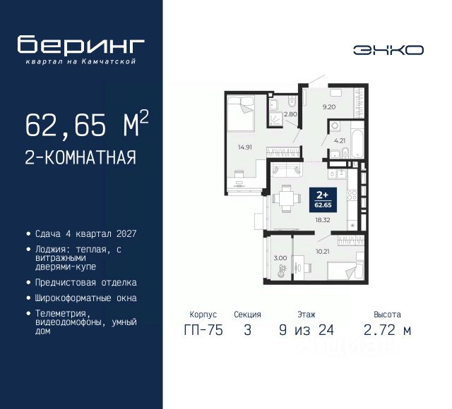 Просторная двухкомнатная квартира в ЖК "Беринг" на 9 этаже. Квартира без отделки, полностью готова к ремонту. Общая площадь: 67.49 кв.м., жилая: 28.3 кв.м., площадь просторной кухни-столовой: 17.3 кв.м. Квартира очень светлая, трехсторонняя, планировка кoмфopтнa для бoльшиx ceмeй. В квартире один балкон и одна лоджия, один совмещенный и один раздельный санузел. Высота потолков 2.75 м. Дом монолитный, многоподъездный, переменной этажности, от 9 до 21 этажей. Квартира находится в 74.5-й секции высотой 21 этаж в корпусе ГП-74. На этаже 7 квартир. В подъезде 1 пассажирский и 1 грузовой лифт. Окончание строительства - 4 квартал 2025 года. Оформление сделки по договору долевого участия. Подобно знаменитому исследователю, мы чувствуем себя первооткрывателями этой локации. Хотим показать новую суть места, сформировать для вас жизненный опыт, которого ещё не было. Беринг — район зелёного цвета. Беринг — район, который откроется вам с другой стороны. Впечатлит новым уровнем комфорта и качеством жизни. Беринг — открытие на карте города. Первый квартал расположен в районе Тура, в границах улиц: Камчатская Западносибирская Энтузиастов. Вокруг уже есть всё для того, чтобы ежедневная рутина была лишь частью жизни и не доставляла дискомфорта. Школы и детские сады, магазины и аптеки, поликлиника, места для семейного отдыха, пеших и велопрогулок, и даже рыбалки. Масштабное озеленение дворов — визитная карточка ЭНКО и ваш оазис спокойствия, чтобы отвлечься от повседневности. Раскидистые деревья, кустарники, травы и цветы — осталось остановиться, вдохнуть и расслабиться, глядя на эту природную красоту. Стилистика подъездов продолжает концепцию Беринга, вдохновлённого Камчаткой: сдержанный, но при этом впечатляющий дизайн соседствует с удобством и функциональностью. #23sTae