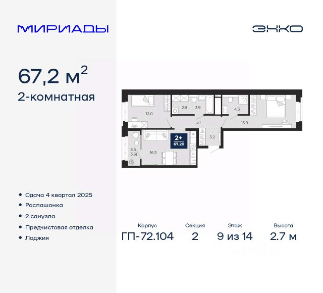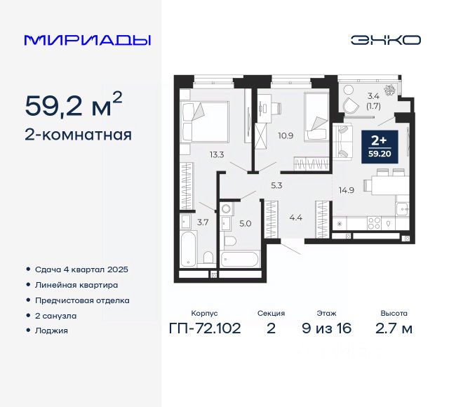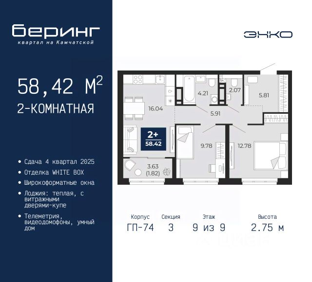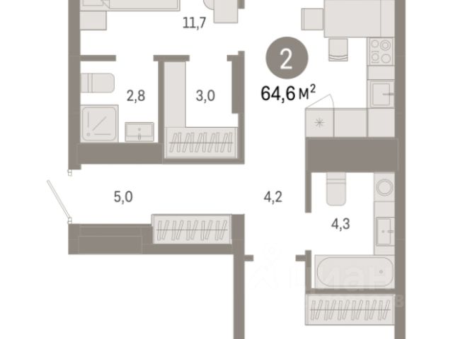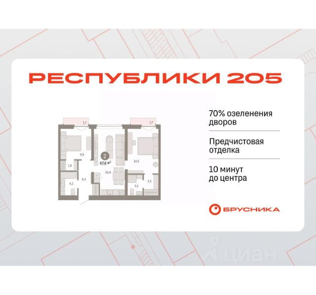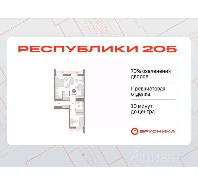 Просторная 2-комн. квартира с предчистовой отделкой в ЖК "Республики 205" на 9 этаже. Общая площадь: 64.55 кв.м., жилая: 23.1 кв.м., площадь просторной кухни-гостиной: 15.6 кв.м. Квартира - распашонка, без проходных комнат, окна выходят на paзные стороны дома. В квартире три балкона, два совмещенных санузла. Высота потолков 2.6 м.