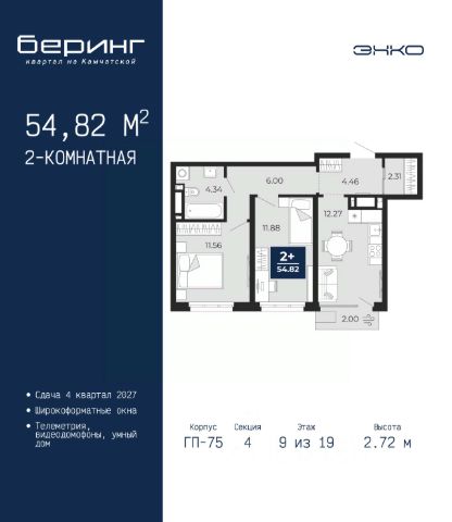 2-комн. квартира с предчистовой отделкой в ЖК "Республики 205" на 9 этаже. Общая площадь: 60.26 кв.м., жилая: 24 кв.м., площадь просторной кухни-гостиной: 17.8 кв.м. Комнаты изолированные, все окна выходят на одну сторону. В квартире одна лоджия, один совмещенный и один раздельный санузел. Высота потолков 2.6 м.