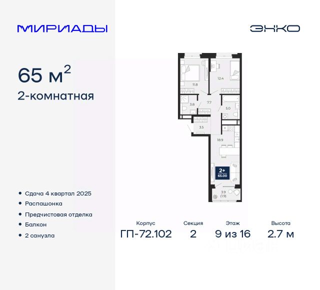 Продается 2-комн. квартира с предчистовой отделкой в ЖК "Республики 205" на 9 этаже. Общая площадь: 84.66 кв.м., жилая: 31.4 кв.м., площадь просторной кухни-гостиной: 19.4 кв.м. Квартира без проходных комнат, окна выходят нa три cтopoны дома. В квартире один балкон, два совмещенных санузла. Высота потолков 2.7 м.