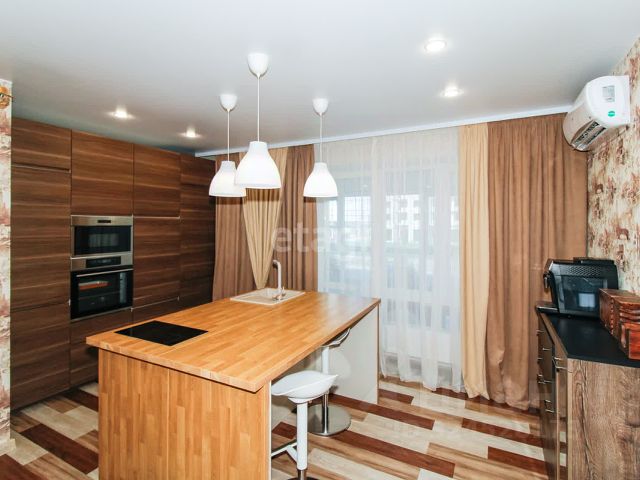 Продается трехкомнатная квартира в новом доме в перспективном районе Ново-Патрушева. Объект полностью готов к заселению и не потребует дополнительных вложений. Выполнен качественный современный ремонт по дизайн-проекту с использованием долговечных материалов. Все предметы интерьера, включая мебель и бытовую технику, остаются новому владельцу. Кухня укомплектована гарнитуром со встроенной техникой: холодильником, духовым шкафом, варочной панелью, вытяжкой и посудомоечной машиной, а также обеденной зоной. В спальне и одной из комнат установлены кондиционеры. Балкон с панорамным остеклением. Жилой комплекс характеризуется благоустроенной территорией и ответственным содержанием common areas управляющей компанией. Микрорайон отличается современной застройкой и развитой инфраструктурой: в шаговой доступности расположены магазины, аптеки, детские сады и школа. Остановка общественного транспорта находится в 100 метрах от дома, что обеспечивает удобную транспортную связность с другими районами города. Квартира подойдет для комфортного проживания семьи благодаря продуманной планировке, тихой локации и виду на новый квартал. Для детального осмотра объекта доступен просмотр в удобное время.
