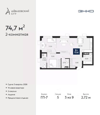 Дом монолитный, многоподъездный, переменной этажности, от 2 до 8 этажей. Квартира находится в 4-й секции высотой 8 этажей в корпусе 3. На этаже 5 квартир. В подъезде 1 грузовой лифт. Окончание строительства - 2 квартал 2027 года. Оформление сделки по договору долевого участия.