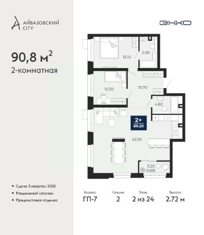 Квартира с кухней-гостиной и двумя спальнями в Доме у озера. Особенности планировки: вид во двор, гардеробная, лоджия, мастер-спальня, предчистовая отделка, разнесённые спальни.