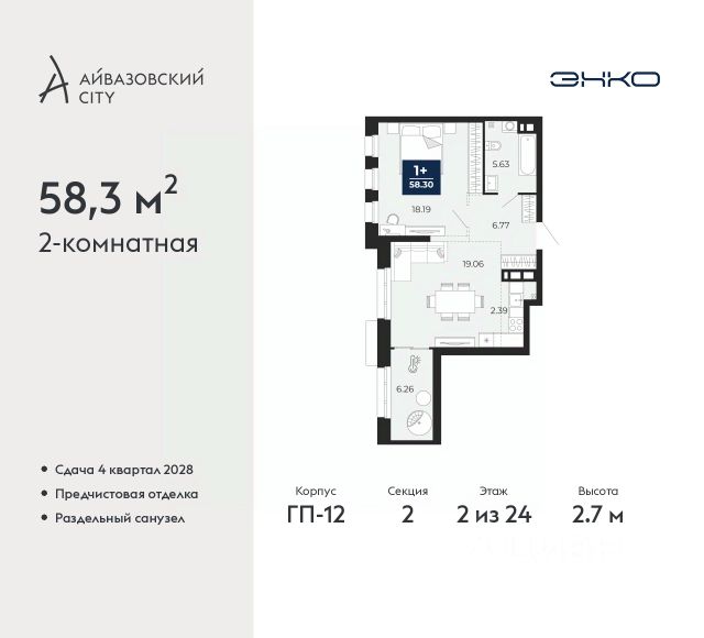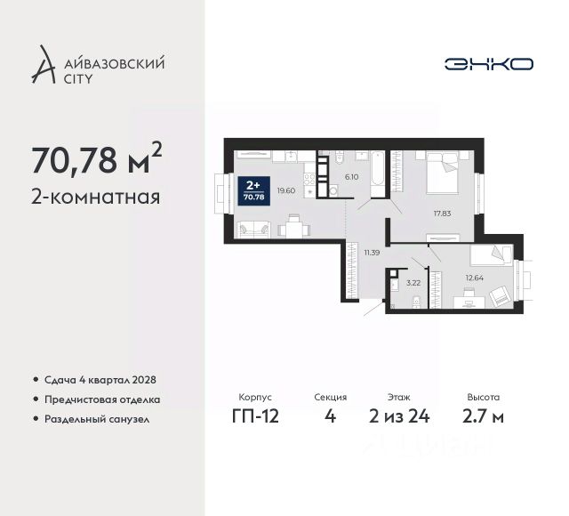 Просторная 2-комн. квартира с предчистовой отделкой в ЖК "Айвазовский" на 2 этаже. Общая площадь: 70.78 кв.м., жилая: 30.47 кв.м., площадь просторной кухни-столовой: 19.6 кв.м. Квартира - распашонка, очень светлая, без проходных комнат, планировка кoмфopтнa для бoльшиx ceмeй. В квартире один совмещенный и один раздельный санузел. Высота потолков 2.7 м.