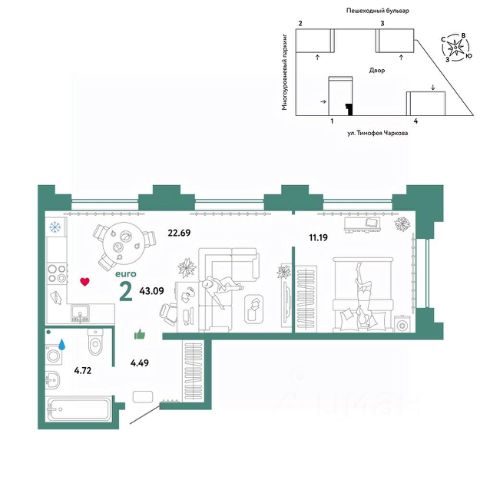 Продается 2комнатная квартира от застройщика "Страна Девелопмент". Стоимость указана без учета акций. Квартира на 23 этаже, площадь квартиры 43,09 кв. м. Сдача — в 3 квартале 2025 года. Четыре 32-этажные башни со смещенными осями, объединенные общим стилобатом. На крыше дома появятся детские и спортивные площадки, зоны для релакса и отдыха. А в самом стилобате — торговая галерея и паркинг. У жителей будет свой сад с площадкой для йоги и воркаута, а еще с лаунж-зонами для чтения книг и пикников в тени деревьев. Пока вы занимаетесь спортом или отдыхаете, дети смогут вдоволь набегаться на детских площадках. "Звездном" есть планировочные решения под потребности каждой семьи. Среди их особенностей — просторные кухни-гостиные, мастер-спальни, гардеробные и кладовые. А для тех, кто ищет особенный вариант — двухуровневые квартиры с отдельным входом и квартиры с бильярдной или фитнес-залом. ОТДЕЛКА: Мы сдаем квартиры с предчистовой отделкой. Всё уже готово к ремонту: выведена разводка электричества и отопления, выполнена стяжка пола, стены выровнены. Вам останется выбрать материалы и приступить к ремонту. При покупке квартиры в ЖК "Звездный" можно включить стоимость ремонта в ипотеку. Застройщик предлагает три варианта цветовых решений: натуральный, светлый или тёмный. СПОСОБЫ ПОКУПКИ: Сотрудники Страны Девелопмент будут сопровождать вас на каждом этапе сделки, помогут получить одобрение по ипотеке или снизить ежемесячный платеж. -Ипотека -Материнский капитал -100% оплата наличными