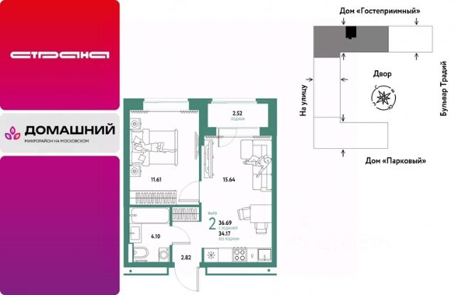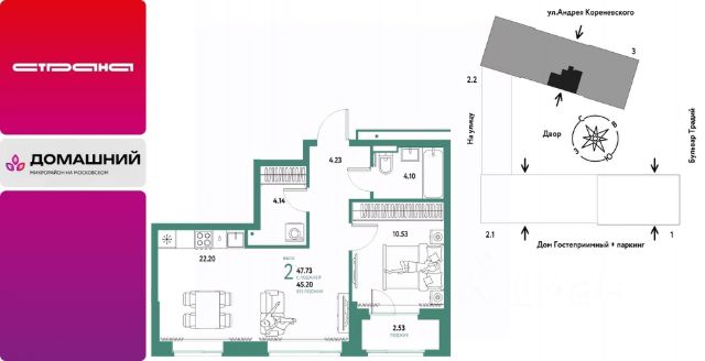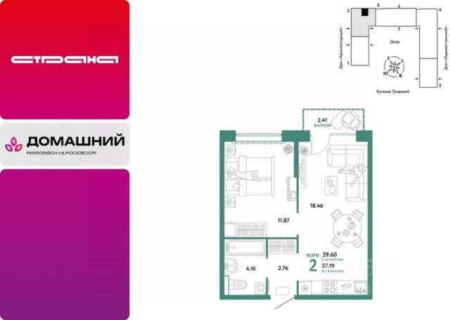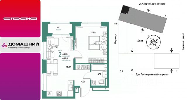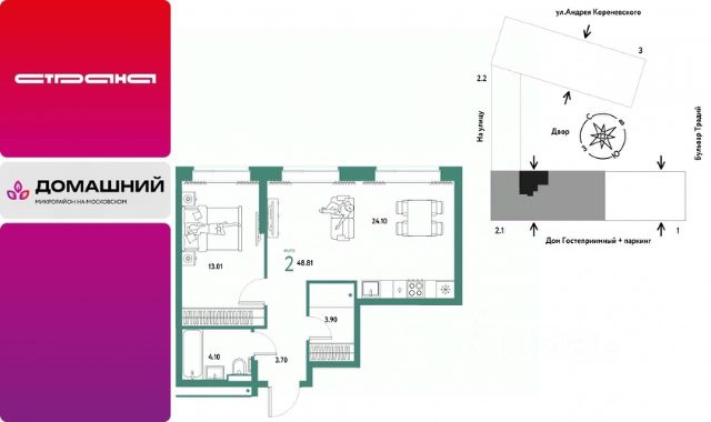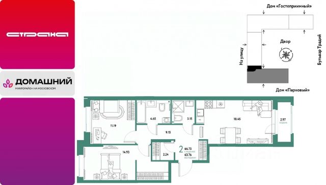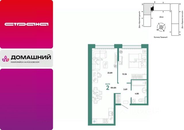 Объявление от застройщика Страна Девелопмент. Покупка квартиры защищена банком. Продается 2комнатная квартира на 2 этаже от застройщика Страна Девелопмент. Площадь квартиры 46,51 кв. м. О ПРОЕКТЕ Микрорайон "Домашний" — это 6 очередей строительства, 24 дома переменной этажности. Каждый дом уникальный. Внутри микрорайона появится огромный пешеходный бульвар — бульвар Традиций. Центром притяжения станут открытые пространства для отдыха жителей и гостей микрорайона, которые легко меняются под сезонные сценарии отдыха: новогодняя елка, ярмарки, кинопоказы и т.д. У каждого дома обустроен приватный двор с зонами для активного и спокойного отдыха. В активной зоне детские разновозрастные площадки с горками, песочницами и качелями, воркаут-зоны. В спокойной — скамейки, мини-амфитеатры, закрытые перголы. Уютной атмосферу сделает обильное озеленение и освещение "домашними" торшерами. ОТДЕЛКА Квартиры сдаются с предчистовой отделкой. Все грязные работы выполнены: произведена разводка электричества и отопления; выполнена стяжка пола; стены выровнены "под маяк". В квартире установлены розетки, выключатели и радиаторы. На входе — надежная стальная дверь. Вам остается только выбрать материалы и начать ремонт Доступна опция "Ремонт от застройщика". Стоимость можно включить в ипотеку. Вы можете заказать один из пяти стилей на выбор: шалфей, хлопковая нить, серый шторм, голубой вереск, белый камень. КУХНЯ С ТЕХНИКОЙ Теперь дополнительно к ремонту можно заказать кухню со встроенной техникой. Эргономику и функциональное наполнение разработали под каждую планировку. ПОЛНАЯ МЕБЛИРОВКА Больше не нужно тратить время даже на подбор, доставку и сборку мебели.Вы можете включить в стоимость квартиры с ремонтом полную меблировку. - Что входит в меблировку? - Кухня с техникой и сантехникой - Диван - Кровать - Шкаф в спальне - Шкаф в прихожей На консультации менеджер подскажет, какие акции действуют, и как получить одобрение по ипотеке с низкой ставкой. Более подробная информация по телефону.