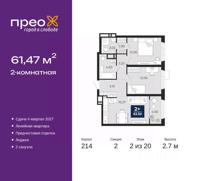 Просторная 2-комн. квартира с предчистовой отделкой в ЖК "Прео" на 13 этаже. Общая площадь: 65.77 кв.м., жилая: 30.88 кв.м., площадь просторной кухни-столовой: 17.49 кв.м. Комнаты изолированные, все окна выходят на одну сторону. В квартире один балкон, два совмещенных санузла. Высота потолков 2.7 м.