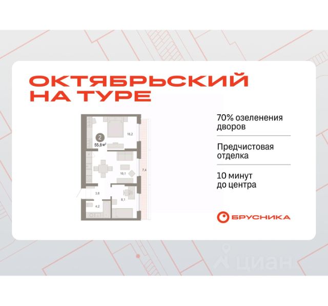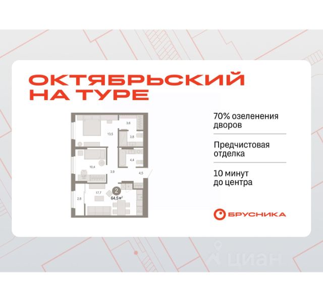 Квартира в счёт первоначального взноса по программе обмена. Квартира с кухней-гостиной и двумя спальнями в Октябрьском на Туре. Особенности планировки: гардеробная, тёплая лоджия, предчистовая отделка, мастер-спальня. квартиры в нашей базе: ОКТ09-Ж1.17.3. Район Проект расположен на берегу реки, в одном из самых живописных и экологичных районов Тюмени. За последние годы облик района изменился. По соседству с индивидуальной застройкой выросли многоквартирные дома. При проектировании "Октябрьского на Туре" нашей приоритетной задачей стало сохранение природного ландшафта: мы постарались деликатно вписать в него современную архитектуру. Квартал удачно расположен с точки зрения дорожной инфраструктуры. На автомобиле путь до центра города составит 15 минут. Добраться до набережной и главных тюменских достопримечательностей можно и на общественном транспорте. В пешей доступности находится автобусная остановка. Проект По мастер-плану здесь будет восемь домов. Ядро застройки составляют замкнутые кварталы переменной этажности. Их высотность понижается по мере приближения к реке. На углах участка мы разместили башни-доминанты. Одной из достопримечательностей квартала станет парк на Туре — здесь появится зеленая зона протяженностью около 6 километров для пеших и велопрогулок. Смысловая ось квартала — широкая главная улица с высаженными вдоль неё высокими деревьями. Они создают тень и работают как шумо- и пылезащитные экраны. Это место сосредоточения основных пешеходных и транспортных потоков, на сторону которых мы ориентировали большинство коммерческих помещений. Отсюда жители могут свернуть на тихие соседские улицы и попасть на внутриквартальную площадь — ещё одну точку притяжения.Квартира в счёт первоначального взноса по программе обмена. #24Ds9E
