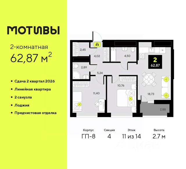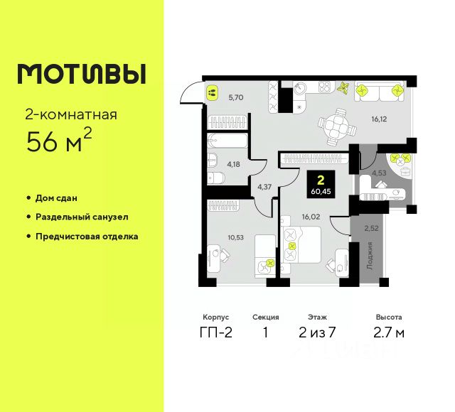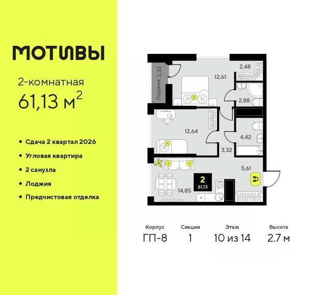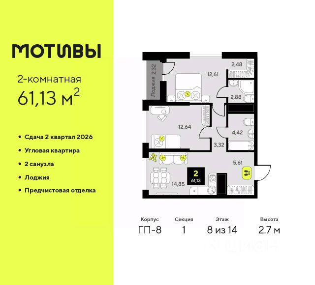 Продается 2-комн. квартира с предчистовой отделкой в ЖК "Мотивы" на 8 этаже. Общая площадь: 61.13 кв.м., жилая: 25.25 кв.м., площадь просторной кухни-столовой: 14.85 кв.м. Угловая квартира, очень светлая, естественная вентиляция при открытии окон. В квартире одна лоджия, два совмещенных санузла. Высота потолков 2.7 м.