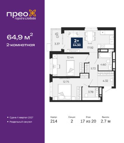 Дом монолитный, двухподъездный, переменной этажности, от 12 до 20 этажей. Квартира находится во 2-й секции высотой 20 этажей в корпусе 214. На этаже 8 квартир. В подъезде 1 пассажирский и 1 грузовой лифт. Окончание строительства - 4 квартал 2027 года. Оформление сделки по договору долевого участия.
