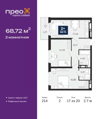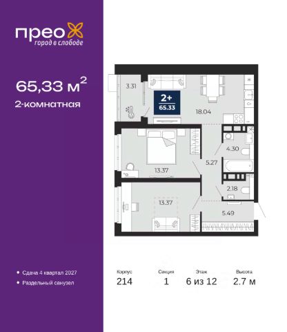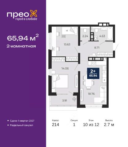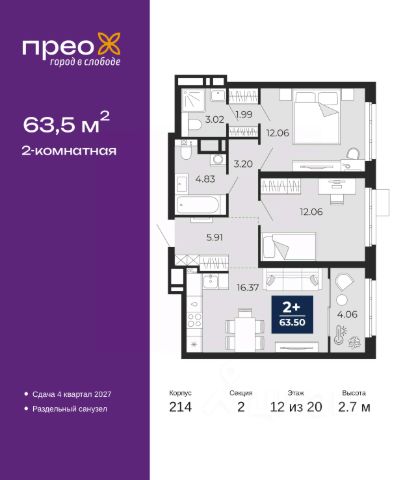 Продается 2-комн. квартира в ЖК "Прео" на 12 этаже. Общая площадь: 63.5 кв.м. Высота потолков 2.7 м.