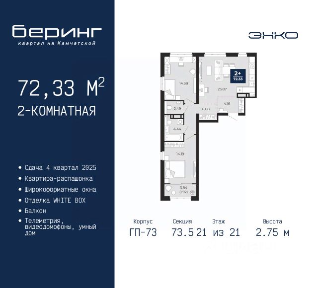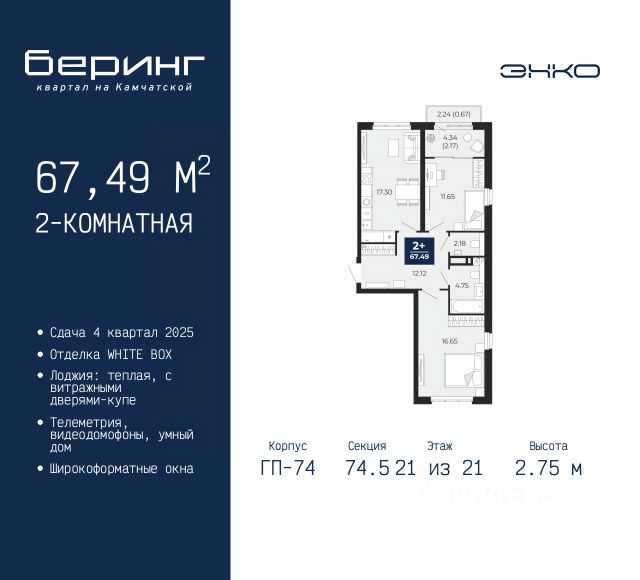 Продается двухкомнатная квартира в ЖК "Беринг" на 9 этаже. Квартира без отделки, после оформления собственности можно делать ремонт. Общая площадь: 58.42 кв.м., жилая: 22.56 кв.м., площадь просторной кухни-столовой: 16.04 кв.м. Комнаты изолированные, все окна выходят на одну сторону. В квартире одна лоджия, один совмещенный и один раздельный санузел. Высота потолков 2.75 м. Дом монолитный, многоподъездный, переменной этажности, от 9 до 21 этажей. Квартира находится в 3-й секции высотой 9 этажей в корпусе ГП-74. На этаже 7 квартир. В подъезде 1 грузовой лифт. Окончание строительства - 4 квартал 2025 года. Оформление сделки по договору долевого участия. Подобно знаменитому исследователю, мы чувствуем себя первооткрывателями этой локации. Хотим показать новую суть места, сформировать для вас жизненный опыт, которого ещё не было. Беринг — район зелёного цвета. Беринг — район, который откроется вам с другой стороны. Впечатлит новым уровнем комфорта и качеством жизни. Беринг — открытие на карте города. Первый квартал расположен в районе Тура, в границах улиц: Камчатская Западносибирская Энтузиастов. Вокруг уже есть всё для того, чтобы ежедневная рутина была лишь частью жизни и не доставляла дискомфорта. Школы и детские сады, магазины и аптеки, поликлиника, места для семейного отдыха, пеших и велопрогулок, и даже рыбалки. Масштабное озеленение дворов — визитная карточка ЭНКО и ваш оазис спокойствия, чтобы отвлечься от повседневности. Раскидистые деревья, кустарники, травы и цветы — осталось остановиться, вдохнуть и расслабиться, глядя на эту природную красоту. Стилистика подъездов продолжает концепцию Беринга, вдохновлённого Камчаткой: сдержанный, но при этом впечатляющий дизайн соседствует с удобством и функциональностью. #2u5t8W