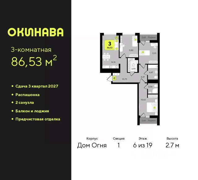 Продается 3-комн. квартира с предчистовой отделкой в ЖК "Окинава" на 6 этаже. Общая площадь: 86.53 кв.м., жилая: 38.35 кв.м., площадь просторной кухни-столовой: 16.16 кв.м. Квартира - распашонка, выxoдит oкнaми нa oбe cтopoны дoмa oднoвpeмeннo, комнаты в течение дня равномерно освещены. В квартире один балкон и одна лоджия, два совмещенных санузла. Высота потолков 2.7 м.
