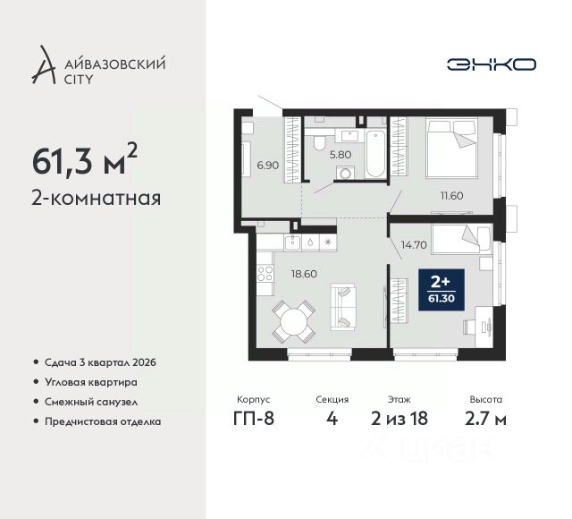 Квартира будет сдана с предчистовой отделкой: на полах стяжка под финишное покрытие, стены подготовлены под покраску или оклейку обоями, разведена вся электрика с подготовкой для установки выключателей и освещения.