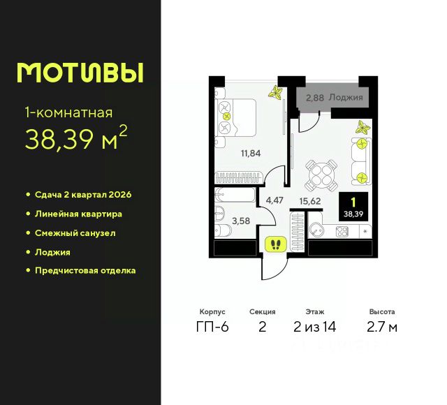 Просторная двухкомнатная квартира с предчистовой отделкой в ЖК "Мотивы" на 12 этаже. Общая площадь: 53.95 кв.м., жилая: 24.24 кв.м., площадь просторной кухни-столовой: 20.1 кв.м. Комнаты изолированные, все окна выходят на одну сторону. В квартире одна лоджия, один совмещенный санузел. Высота потолков 2.7 м. Квартира будет сдаваться с предчистовой отделкой White Box: выровнены и оштукатурены стены, проведено электричество и отопление, установлены радиаторы. Вы также можете приобрести квартиру с ремонтом от застройщика, представленным в трех цветовых решениях Scandi, Wood и Coffee и включающим ламинат, обои под покраску, двери, натяжной потолок и санузел с сантехникой. При желании вы можете заказать отделку под ключ, варианты возможных решений представлены в альбоме фотографий. Дом монолитный, двухподъездный, переменной этажности, от 12 до 14 этажей. Квартира находится во 2-й секции высотой 12 этажей в корпусе ГП-1. На этаже 12 квартир. В подъезде 1 пассажирский и 1 грузовой лифт. На сегодняшний день строительство окончено, дом сдан в 4 квартале 2024 года. Оформление сделки по договору купли-продажи. Закрытая от автомобилей территория, безопасный двор и камеры видеонаблюдения - гаранты вашего спокойствия. Квартал будет располагать богатой инфраструктурой: на первых этажах разместятся магазины, пекарни, кофейни, пункты выдачи, аптеки, детские центры, цветочные салоны и многое другое, что сделает жизнь поистине комфортной. Рядом находится парк общей площадью почти 5000 м², в котором располагаются локации для игр и отдыха жителей, здесь можно совершить утреннюю пробежку или прогуляться после рабочего дня. В парке есть зона воркаута с тренажерами для взрослых, игровые комплексы с горками и канатный комплекс для детей разных возрастов, качели и лавочки для отдыха, площадки для командных видов спорта и для панна-футбола. В ЖК "Мотивы" всё продумано до мелочей: светлые холлы входных групп, оформленные в едином стиле, просторные колясочные, лапомойки для питомцев. На территории комплекса находятся 2 8-ми этажных паркинга и более 1000 м/м на открытой парковке. Жилой комплекс находится в одном из экологически благоприятных районов Тюмени, недалеко от Плехановского бора. При этом до центра города можно добраться за 15 минут, а до международного аэропорта Рощино за 13 минут. Окончание строительства: ГП 1, 2, 3, 4 сдача до конца 2024 года, ГП 6, 7, 8 сдача 2 квартал 2026 года. #zWEouM