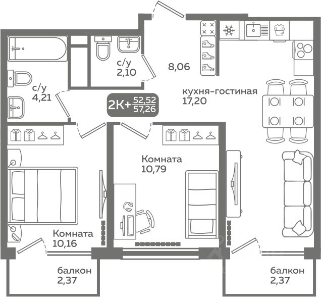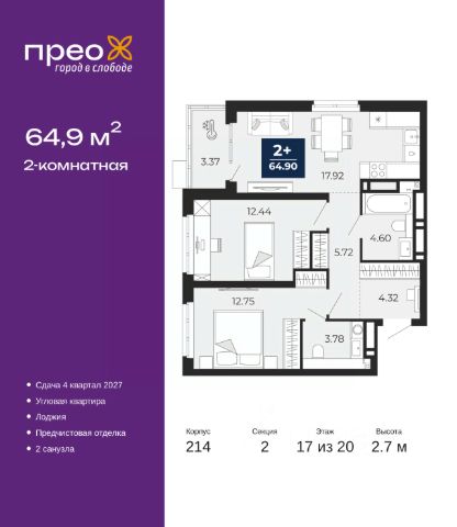Просторная двухкомнатная квартира с предчистовой отделкой в ЖК "Прео" на 17 этаже. Общая площадь: 64.9 кв.м., жилая: 25.19 кв.м., площадь просторной кухни-столовой: 17.92 кв.м. Угловая квартира, очень светлая, естественная вентиляция при открытии окон. В квартире одна лоджия, один совмещенный и один раздельный санузел. Высота потолков 2.7 м.