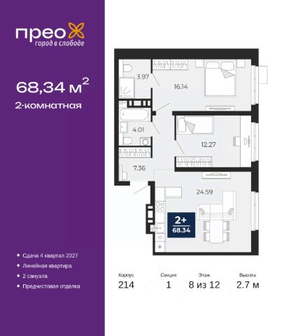 Дом монолитный, двухподъездный, переменной этажности, от 12 до 20 этажей. Квартира находится во 2-й секции высотой 20 этажей в корпусе 214. На этаже 8 квартир. В подъезде 1 пассажирский и 1 грузовой лифт. Окончание строительства - 4 квартал 2027 года. Оформление сделки по договору долевого участия.