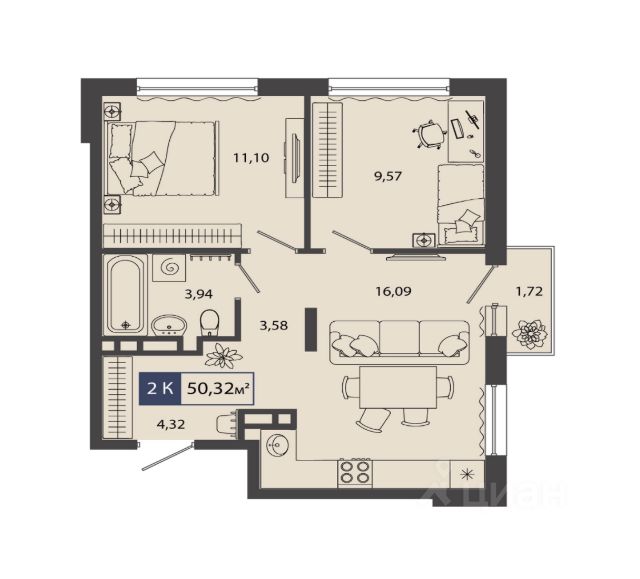 Продаётся квартира площадью 58.22 м2 в жилом комплексе "Смородина". Квартира находится на 4 этаже дома, который будет введен в эксплуатацию в 1 квартале 2026 года. Жилая площадь квартиры 24.87 м2, площадь просторной кухни — 18.39 м2. Среди особенностей планировки — изолированные комнаты с окнами на одну сторону, 1 совмещённый санузел. Жилой комплекс "Смородина" — это: уютный малоэтажный комплекс в районе ММС дома высотой 4 этажа квартиры от студий до семейных вариантов с отапливаемыми лоджиями экологичные материалы в благоустройстве территории 1 очередь — срок сдачи в 2025 году 2 очередь — III кв. 2026 3 очередь — IV кв. 2026 Окружение В 5 минутах ходьбы от проекта — озеро Липовое с песчаным пляжем и лесопарковая зона. Инфраструктура В шаговой доступности есть все для комфортной жизни: школы, детские сады, магазины и аптеки. Рядом с проектом — остановка общественного транспорта. Благоустройство Прямо во дворе — собственные грядки для жителей, где можно выращивать зелень и цветы. Для детей оборудованы детские площадки из натуральных материалов. Лобби Вдохновленные современными тенденциями наши парадные разработаны с акцентом на эстетическую привлекательность и практичность. Использование натуральных материалов и ярких цветовых акцентов создает атмосферу уюта и стиля. Планировки Среди многообразия продуманных планировок есть и уютные студии, и просторные семейные варианты. Во всех квартирах предусмотрены отапливаемые лоджии, где можно устроить зону отдыха или рабочий кабинет.