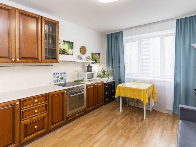 При продаже остается кухонный гарнитур со встроенной техникой, холодильник, стиральная машинка, встраемые шкафы.