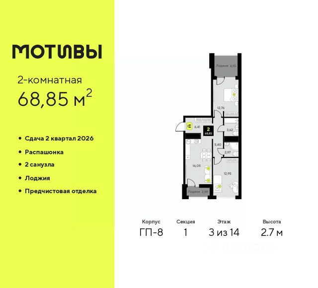 Продаётся квартира площадью 54.51 м2 в жилом комплексе "Дабл-Дабл". Квартира находится на 15 этаже, жилая площадь квартиры 26.28 м2, площадь просторной кухни — 10.27 м2. Среди особенностей планировки — изолированные комнаты с окнами на одну сторону, 1 совмещённый санузел. Срок сдачи — II кв. 2028 Жилой комплекс "Дабл-Дабл" — это: - проект комфорт-класса на Московском тракте - дома высотой 15 этажей - квартиры от 1-комнатных до 2-уровневых Окружение На границе жилого комплекса — живописный лес. Достаточно открыть окна, чтобы впустить в комнаты ароматы зелени, прохладу и чистый воздух. Благоустройство Юные жители оценят игровые площадки и воркаут-зоны. Любителям неспешных прогулок понравится 2-уровневый променад с панорамным видом и навесами. Лобби Помещения встречают дизайнерскими интерьерами с уютными лаунж-зонами, где удобно подождать курьера или просто сделать паузу перед возвращением домой. Колясочные Возвращайтесь налегке после прогулки с малышом — оставить коляску можно в специальном помещении на первом этаже. Кладовые Благодаря индивидуальным помещениям на техническом этаже сезонные и габаритные вещи будут на своём месте. 2-уровневые квартиры Просторная гостиная и кухня располагаются на первом этаже, спальня и кабинет — на втором. Почувствуйте, как жизнь выходит на новый уровень комфорта и приватности. Панорамное остекление Окна в пол наполняют комнаты светом и стирают границы между домом и природой. Встречайте рассветы или наслаждайтесь огнями вечернего города. Отделка Ровные стены, подготовленные полы и проведённые коммуникации — мы взяли на себя самые грязные и трудоёмкие этапы ремонта. Квартира станет чистым холстом, где легко создать интерьер в любом стиле.