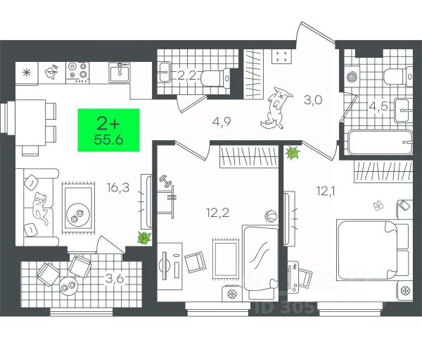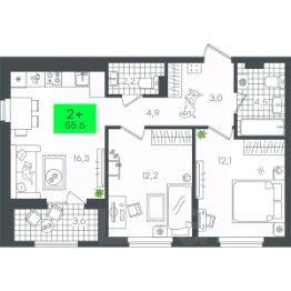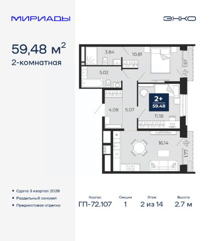 2-комн. квартира с предчистовой отделкой в ЖК "Мириады" на 2 этаже. Общая площадь: 59.48 кв.м. Высота потолков 2.7 м. Дом монолитный, двухподъездный, переменной этажности, от 14 до 16 этажей. Квартира находится в 1-й секции высотой 14 этажей в корпусе ГП-72.107. На этаже 5 квартир. В подъезде 1 пассажирский и 1 грузовой лифт. Окончание строительства - 3 квартал 2028 года. Оформление сделки по договору долевого участия. Вселенная бесконечных историй. Ранее невиданный Тюмени масштаб: территория 240 гектаров и 1 650 000 м² застройки. Мириады это город масштабных перемен и больших возможностей. Город зеленых рощ и зеркальных озер. Город для работы, учебы и развлечений. Город для детей и их родителей. Город для всех и каждого. Проект расположен в районе Мыс рядом с ТРЦ "Тюмень Сити Молл" в границах улицы Тимофея Чаркова, Тобольского тракта и объездной дороги. Срок полного освоения территории - до 2034 года. #z6dFVg Купить 2-комнатную квартиру до 8 млн. рублей в Тюменской области.