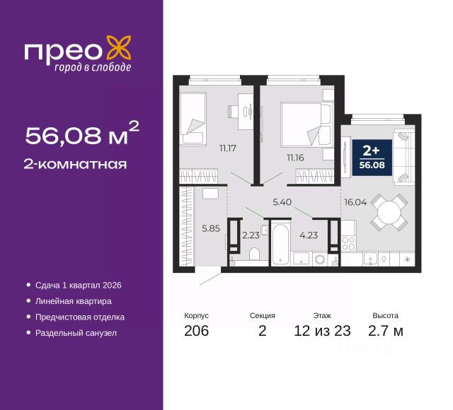 Двухкомнатная квартира с предчистовой отделкой в ЖК "Прео" на 12 этаже. Общая площадь: 56.08 кв.м., жилая: 22.33 кв.м., площадь просторной кухни-столовой: 16.04 кв.м. Комнаты изолированные, все окна выходят на одну сторону. В квартире один раздельный санузел. Высота потолков 2.7 м.