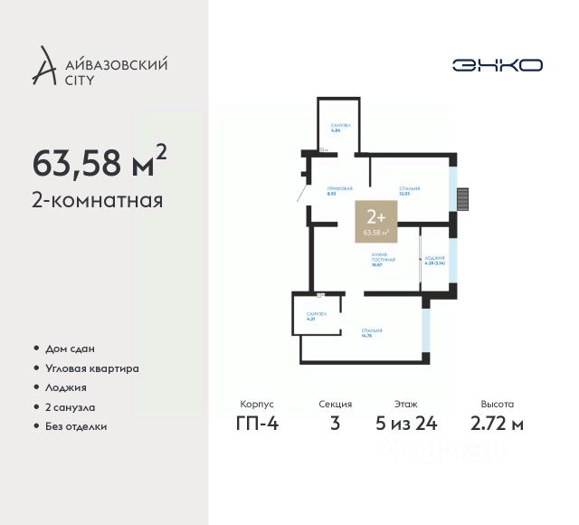 Двухкомнатная квартира в ЖК "Айвазовский City" на 5 этаже. Квартира без отделки, после оформления собственности можно делать ремонт. Общая площадь: 63.58 кв.м., жилая: 26.79 кв.м., площадь просторной кухни-столовой: 16.67 кв.м. Угловая квартира, окна oбecпeчивaют paвнoмepнoe ocвeщeниe в тeчeниe дня. В квартире одна лоджия, два совмещенных санузла. Высота потолков 2.72 м. Дом монолитный, многоподъездный, переменной этажности, от 9 до 24 этажей. Квартира находится в 3-й секции высотой 24 этажа в корпусе ГП-4. На этаже 6 квартир. В подъезде 2 пассажирских и 2 грузовых лифта. Строительство окончено, дом сдан в 4 квартале 2023 года. Оформление сделки по договору купли-продажи. Новый жилой район располагается в живописном месте на берегу Туры в центральной части города. Принципиально новое пространство для жизни в центре современного города для тех, чьи мечты сбываются, кто нацелен на постоянный рост, перемены к лучшему для себя и своих близких. Каждая деталь Айвазовский City вдохновляет и заряжает на новые свершения: авторская архитектура, сбалансированная продуманная инфраструктура, дизайнерские дворы со спортивными и детскими площадками, парковые зоны с фонтанами, водный канал, украшающий центральный прогулочный маршрут района и многое другое. В 2019 года проект стал лауреатом престижной премии Urban Awards 2019 в номинации "Лучший строящийся региональный жилой комплекс бизнес-класса". Главная особенность Айвазовский City - соседство разных архитектурных школ в рамках одного дома. Изысканная классика, выразительная эклектика и оригинальный модерн - жить в одном из таких домов настоящий повод для гордости. Айвазовский City это идеальное сочетание комфорта, технологий и развитой инфраструктуры. Вход в подъезд возможен с улицы и со двора. Отправляясь на работу или за покупками, жители могут выйти с внешней стороны дома, а для прогулки с ребенком со стороны двора. Экологически чистые материалы и энергосберегающие технологии, качественное освещение общественных зон, видеонаблюдение по всей территории жилого района (в том числе в подъездах, лифтах и в подземном паркинге), закрытые дворы с доступом только для жителей Айвазовский City. Часть домов в Айвазовский City будут оснащены подземным паркингом. Востребованный в нашем климатическом поясе формат хранения автомобилей защитит собственность владельца в любое время года. Аккредитация в банках: "Сбербанк России", ПАО "Газпромбанк", ОАО "Альфа-Банк", ПАО Банк "ВТБ", ПАО АКБ "Абсолют Банк" и других. #2MtFdE Купить 2-комнатную квартиру в готовой новостройке в округе Центральный в городе Тюмень.