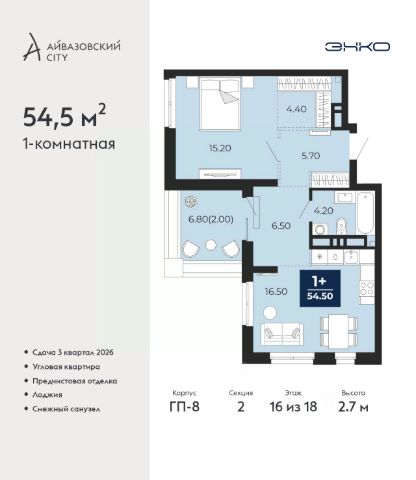 Квартира с кухней-гостиной и двумя спальнями в кварталах "На Минской". Особенности планировки: балкон, вид во двор, гардеробная, мастер-спальня, окна на две стороны, предчистовая отделка, разнесённые спальни.