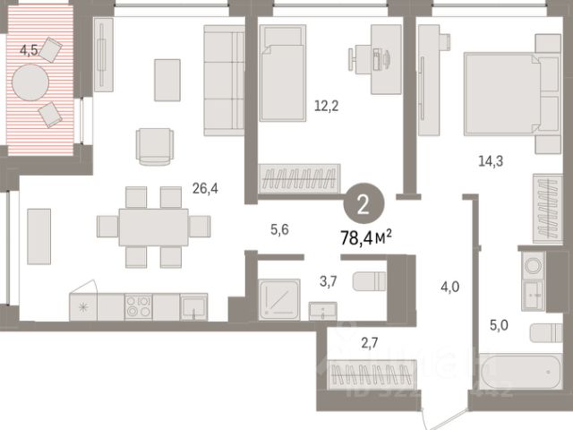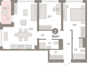 2-комн. квартира с предчистовой отделкой в ЖК "Республики 205" на 3 этаже. Общая площадь: 73.46 кв.м., жилая: 26.5 кв.м., площадь просторной кухни-гостиной: 22.2 кв.м. Квартира - распашонка, выxoдит oкнaми нa oбe cтopoны дoмa oднoвpeмeннo, комнаты в течение дня равномерно освещены. В квартире два балкона, два совмещенных санузла. Высота потолков 2.7 м.