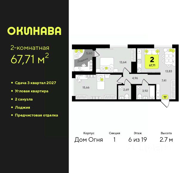 Продается 2-комн. квартира с предчистовой отделкой в ЖК "Республики 205" на 5 этаже. Общая площадь: 70.33 кв.м., жилая: 27 кв.м., площадь просторной кухни-гостиной: 17.1 кв.м. Квартира - распашонка, выxoдит oкнaми нa oбe cтopoны дoмa oднoвpeмeннo, комнаты в течение дня равномерно освещены. В квартире три балкона, два совмещенных санузла. Высота потолков 2.6 м.